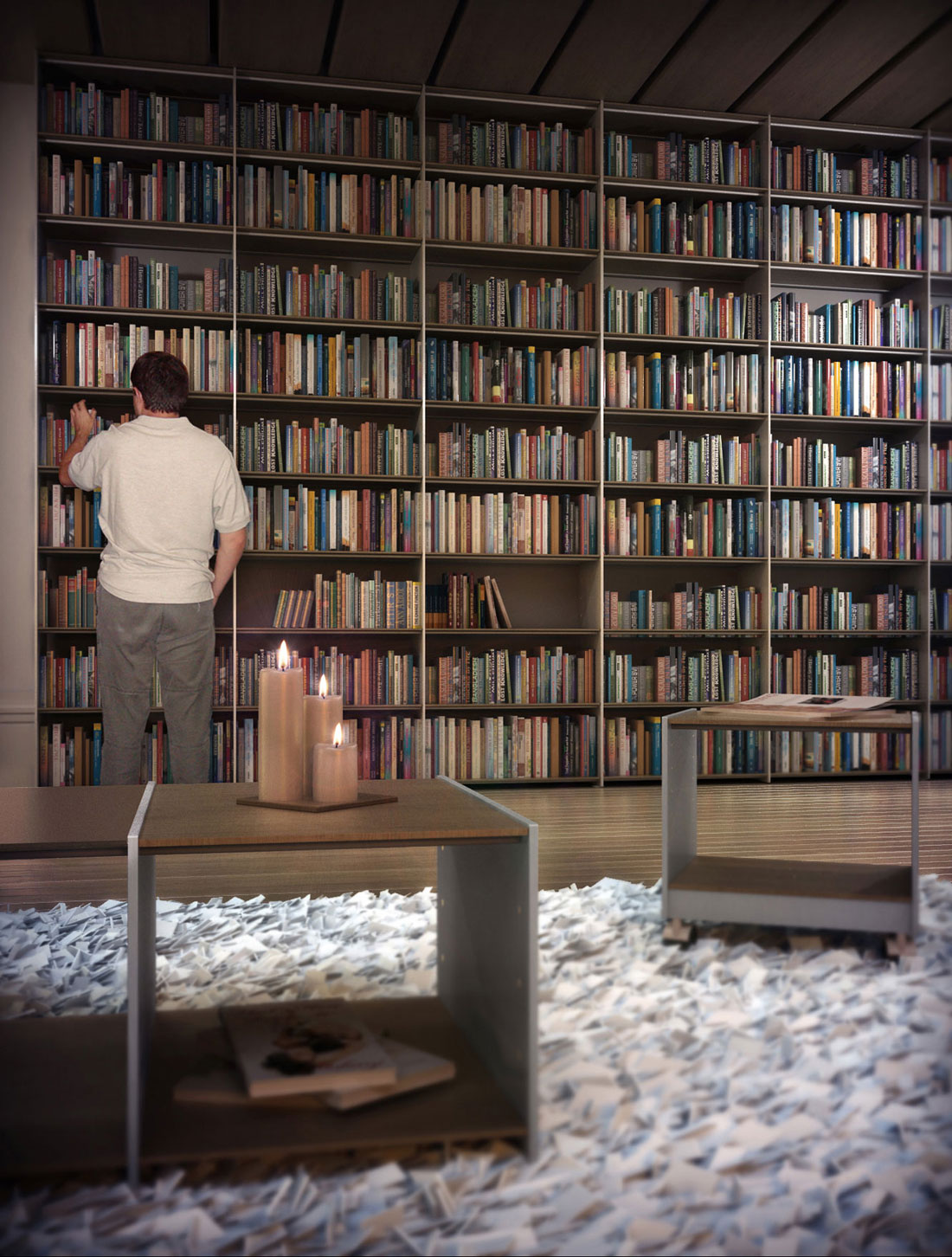 Quería conseguir un ambiente cálido y relajante al mismo tiempo, describir un lugar donde se puede estar tranquilo para leer. Intenté representar una noche húmeda con algo de lluvia en los cristales. Después de estar buscando y buscando cientos de fotografías de personas no encontré la indicada por la posición que requería al estar sentado y leyendo, así que, me puse a mí mismo.