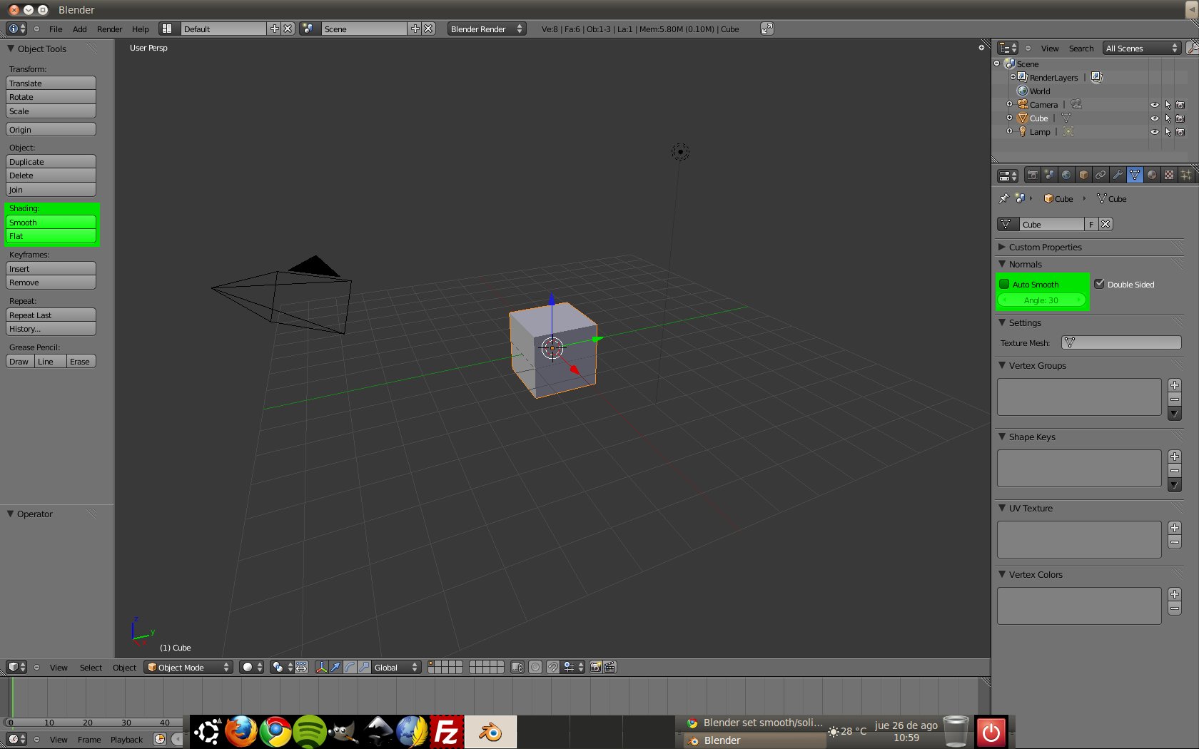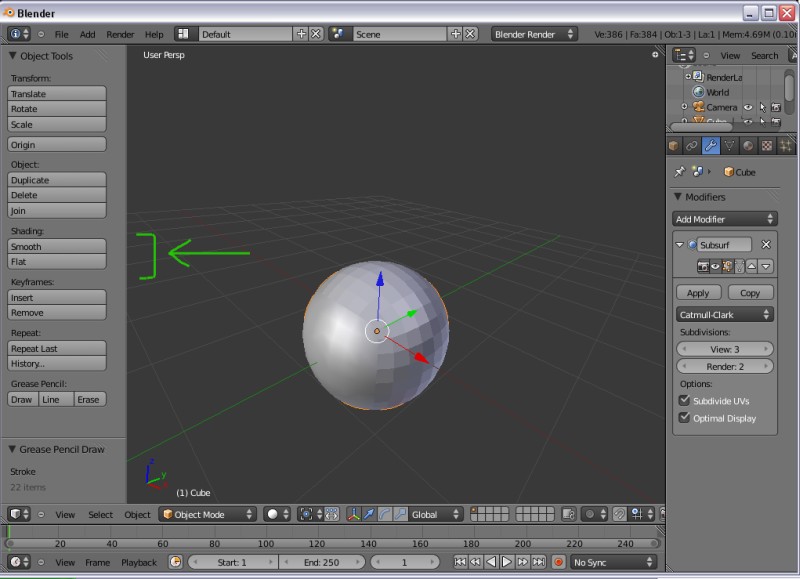 Bueno, pues una pregunta tonta, pero que me está dando para marearme durante toda la mañana. ¿Dónde está la opción set smooth/set solid en Blender 2.5? Me refiero a la opción que hace que cuando usas un modificador Subsurface, la malla se visualice con las subdivisión suavizada o sin suavizar. En el 2.49 estaba en la pestaña enlaces and materiales cuando pasabas a modo objeto, pero en el 2.5 no encuentro ni la pestaña ni la opción.