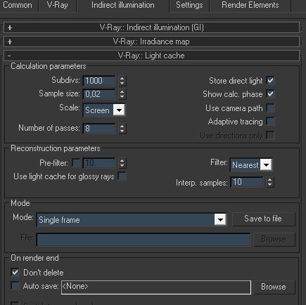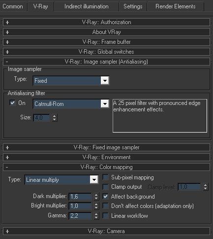 He usado una cámara Vray física, con f-number 8 y shutter 250, en las ventanas dos luces Vray y un Vray Sun y Sky.