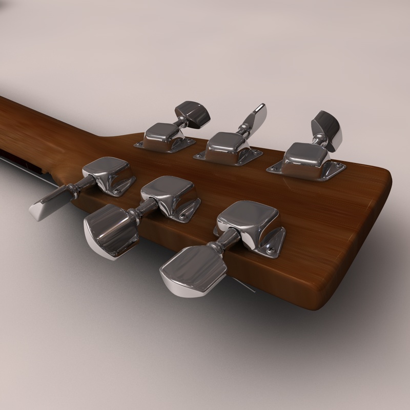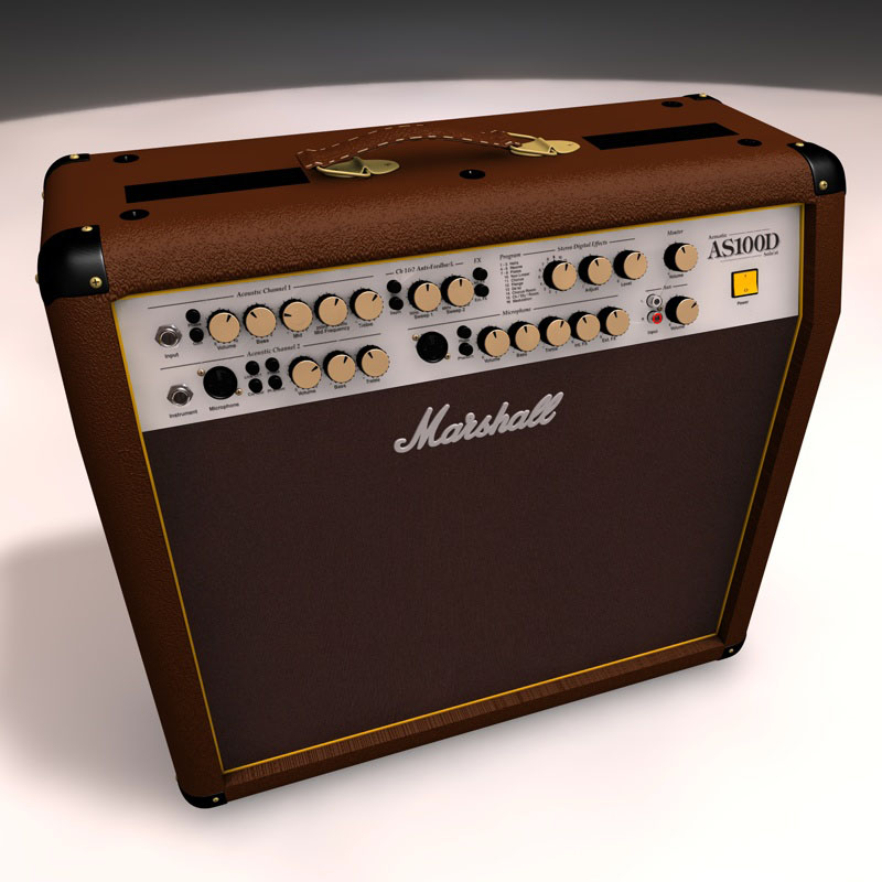 Me gusta. Igualmente hay dos cosas que me llamaron la atención cuando lo vi, la primera es la parte del parlante del amplificador, es como un color plano, yo en tu lugar haría un opacy map con agujeros para simular una chapa acanalada.