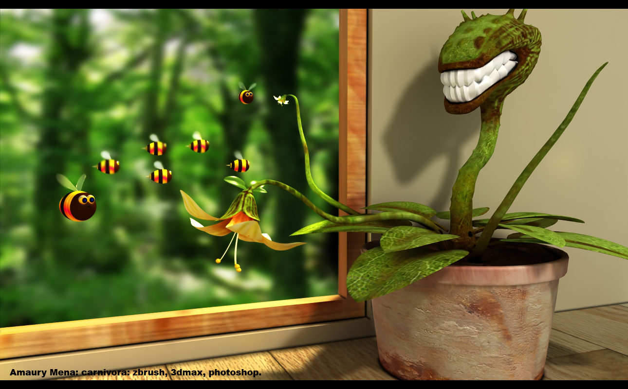 Me gusta la planta (aunque, quizás los dientes son demasiado blancos para mí gusto). Lo único que no me convence es la ventana, ya que tiene un marco muy estrecho y con poco grosor (la pared parece de cartón con esa medida) y, es más parecido al de un cuadro que al de una ventana. Además, el desenfoque del fondo lo veo un poco exagerado.