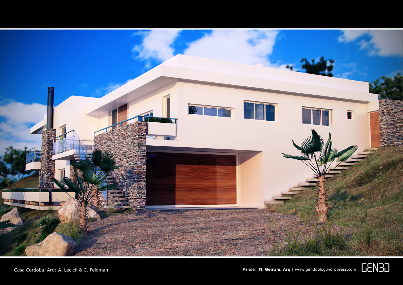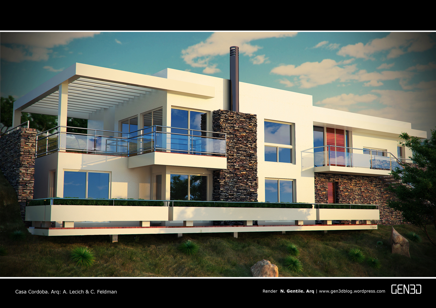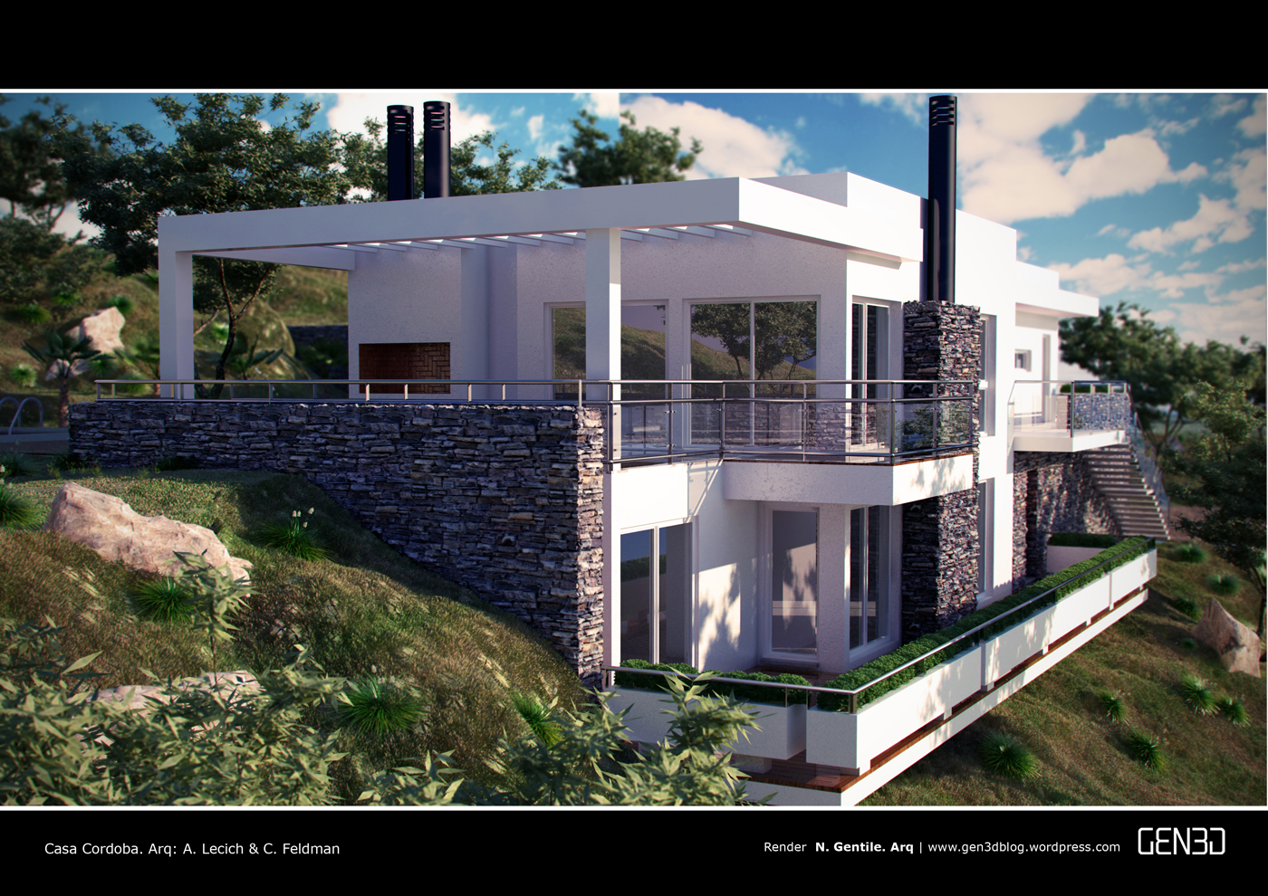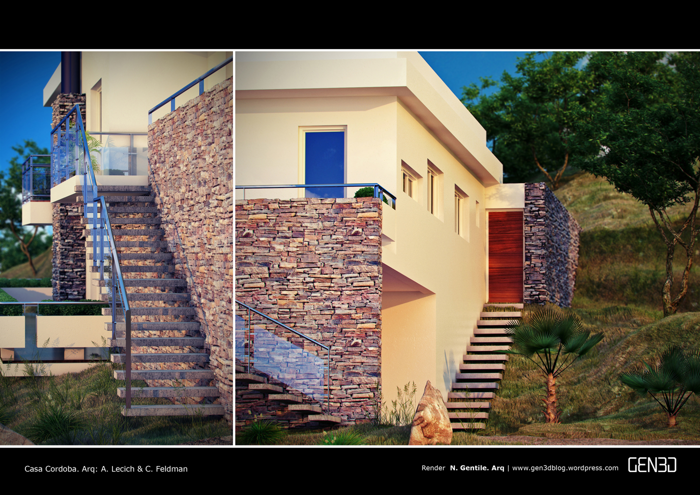 Lo que es la piedra en la fachada y el terreno muy buenos, las primeras imágenes tienen un vignetting bastante exagerado, no sé si lo sacaste con la cámara o lo hiciste en Adobe Photoshop, no exageres en esto, la iluminación no me convence del todo, está muy contrastada, muy oscura en unas partes y muy brillante o quemado, en otras, te falta en los vidrios, tienen un reflejo muy exagerado y el cielo no mola, yo habría ambientado mucho más el landascape de las terrazas, se nota muy seco, en general traen bastante intención, pero te falta en unos aspectos y te sobra en otros.