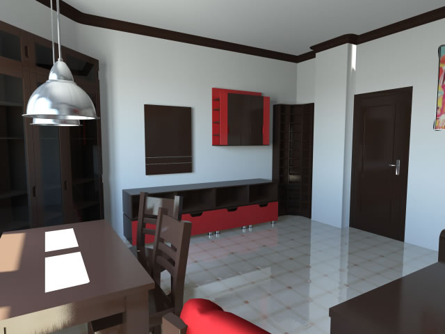 En el segundo, se trata de un problema gordo, pues los materiales no se comportan bien con la luz directa e inmediata a esta. Es decir, en las zonas donde incide la luz directa, y las muy próximas el material pierde completamente sus propiedades, quedando renderizado de una manera horrorosa. No ocurre así en zonas más alejadas de la luz. En la imagen os muestro un render, usando Mental Ray (configuración básica por defecto), Mental Ray photographic exposure control (indor preset) un system dayligth como luz principila y un par de Mental Ray Sky portals en las ventanas, y como material de la mesa y resto de muebles un Arch and design Wood varnished por defecto, con color marrón oscuro en lugar de un bitmap. Se puede ver claramente lo que explico en la mesa próxima y como no se renderiza bien. No ocurre así con los muebles del fondo con su color original, bañados por iluminación indirecta.