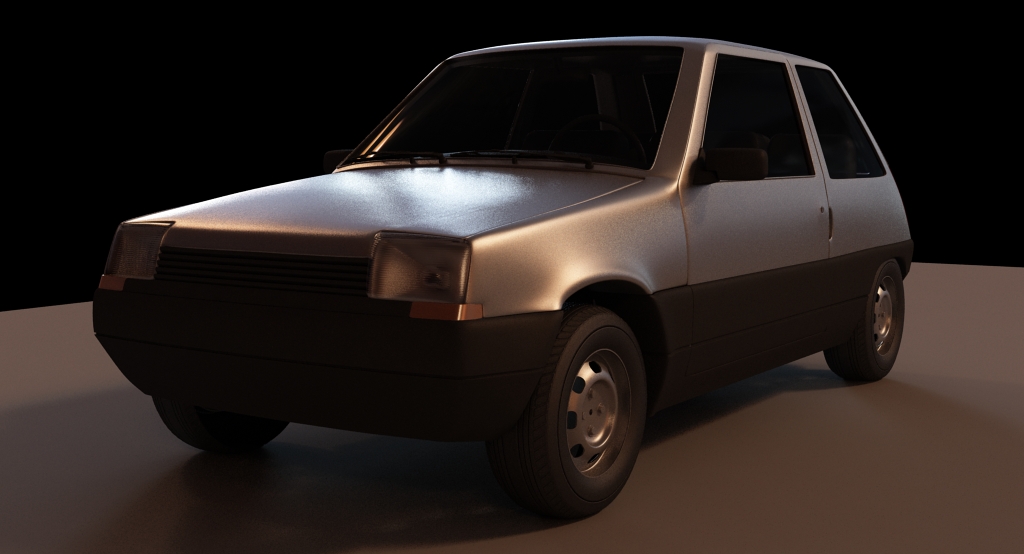 Por otro lado, los faros del coche probé jugando con un alpha en el IOR con unas líneas paralelas simplemente. Se puede mejorar, pero me gustó el resultado. De todas formas, no tiene hecho aún el Unwrap y se ve algo raro.