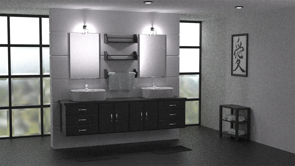 Pues la escena, es un interior, con un gran ventanal que deja entrar luz desde el exterior. En el interior, delante del ventanal hay una pared, y por el lado de dentro unos lavabos. La resolución es 1980 por 1920. Subo una imagen para que os hagáis una idea, aunque es a baja resolución y era un render de prueba, por eso tiene tanto ruido, no conservé el final en Hd(pongo final entre comillas porque aún le quedaba bastante ruido). Está claro que mi novatividad en estos menesteres me lleva a cometer seguramente, algunos errores que costaran mucho a la hora de renderizar, pero no sé cuales.
