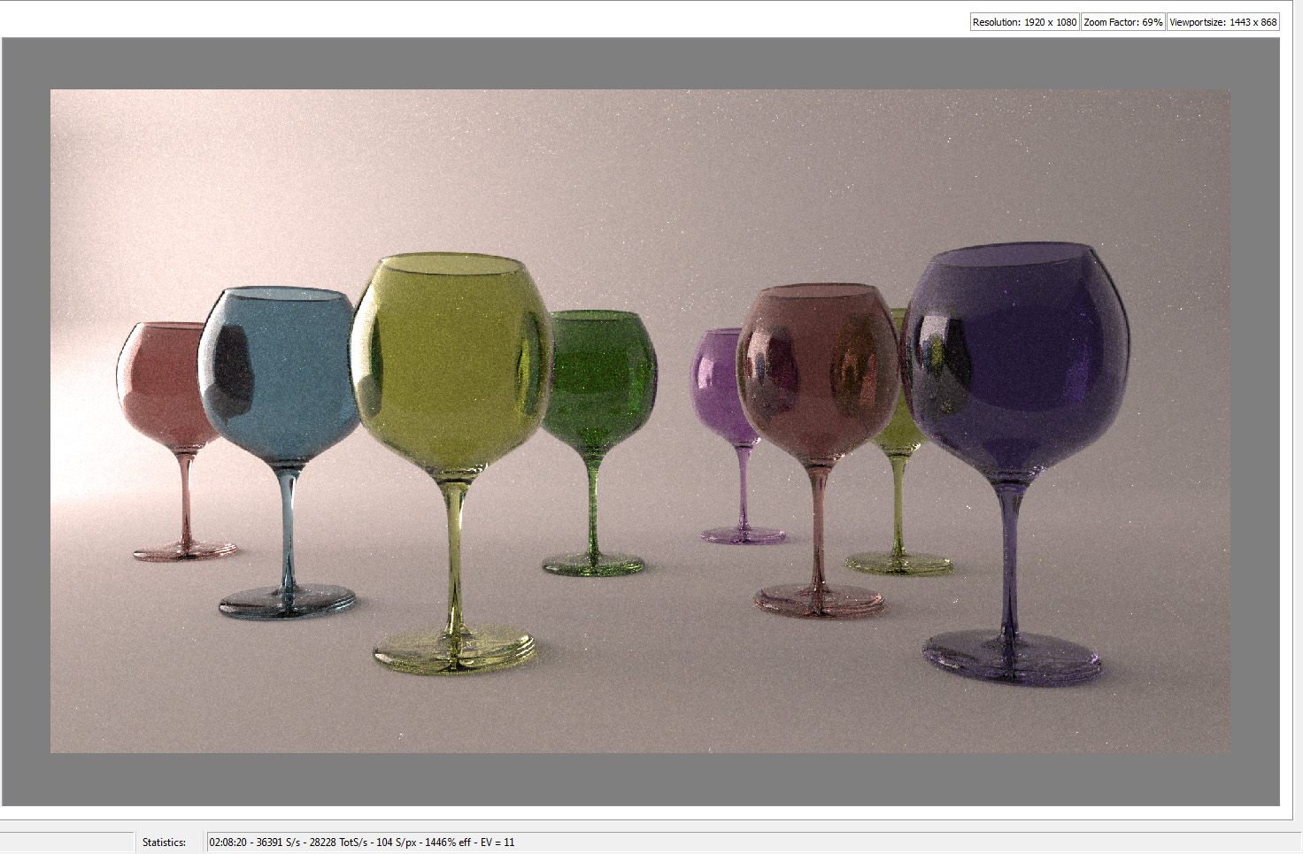 A propósito: algunos lo sabréis por el otro hilo, pero finalmente me he comprado el thea render. He probado con la escena de las copas en modo unbiased, por curiosidad, a una resolución de 1600 por 1200, con Dof y luz solar, y en más o menos una hora apenas tenía ruido.
