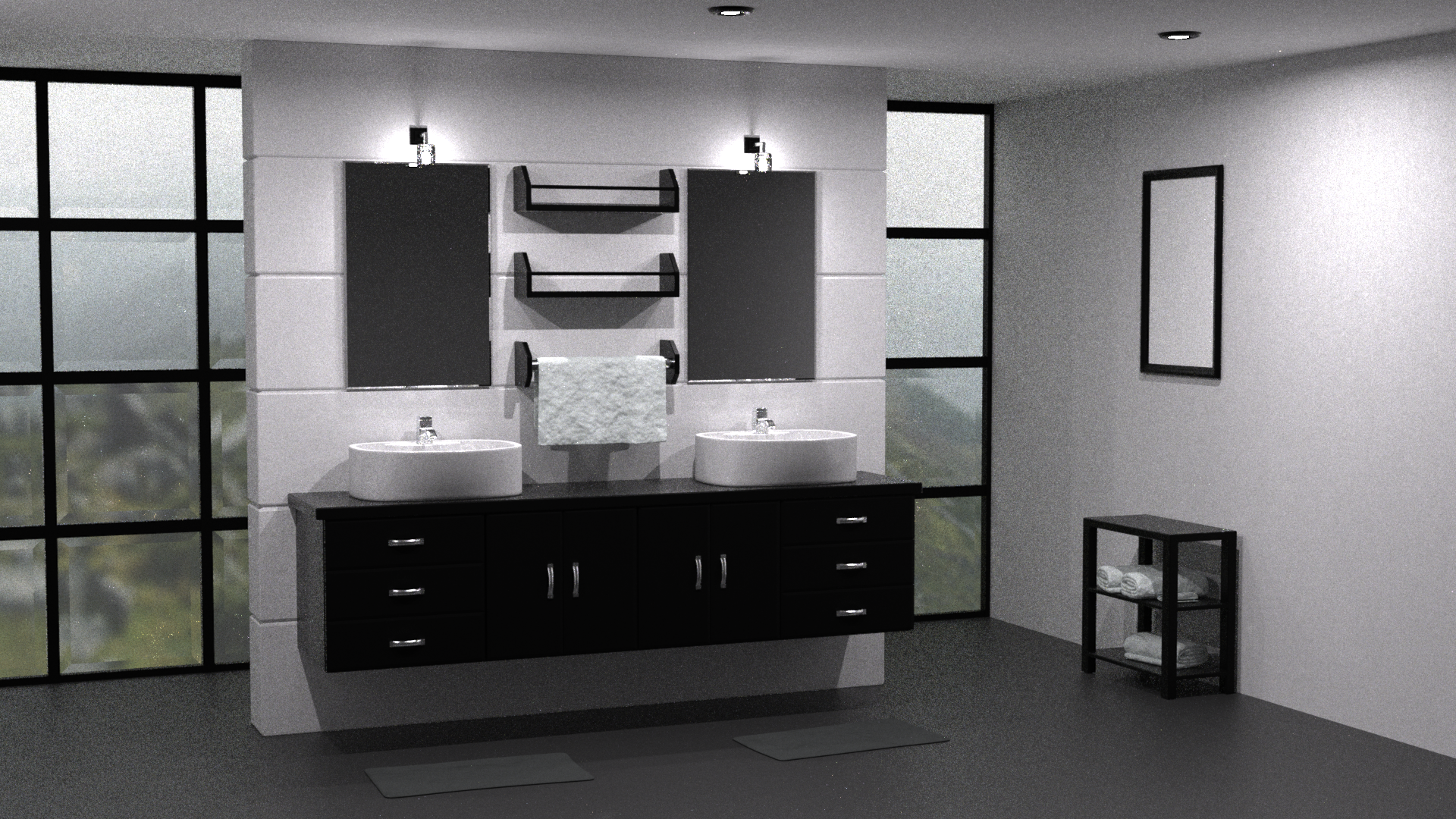 Muy bueno ese también. A ver si poco a poco vamos tocando los parámetros adecuados. He probado a sacar el baño de nuevo, sin los cristales y con sol entrando por la ventana, aun así, tras 5 horas y media de render hay demasiado ruido. El problema son los puntos blancos, por lo que veo haciendo estas pruebas resulta que si nada más empezar el render hay algún hotspot por ahí, va a tirarse mucho tiempo limpiando, sin embargo, cuando el render es bueno, desde el principio solamente se ve un ruido más o menos uniforme.