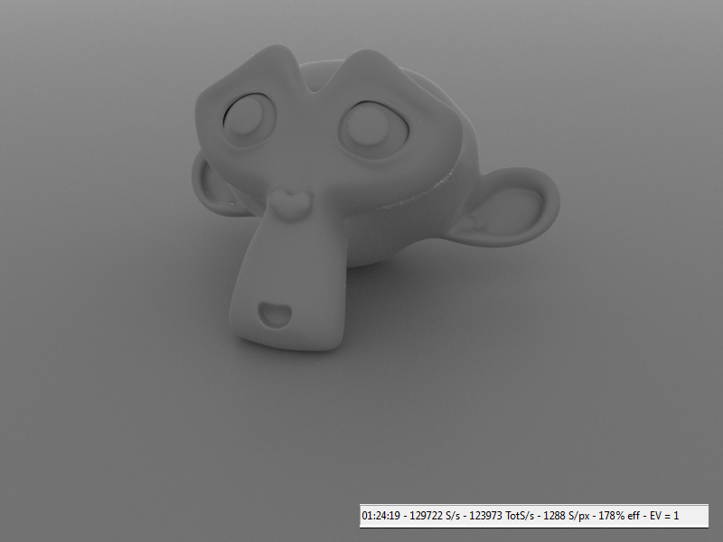 Eso sí, en el render del mono, desde el primer momento no hubo los fastidiados puntos blancos, que cuesta mucho que se vayan, así que, creo que ni en 100 horas tendría un render limpio de hotspots. Mañana trataré de buscar por que razones se producen, a ver cómo se puede solucionar.