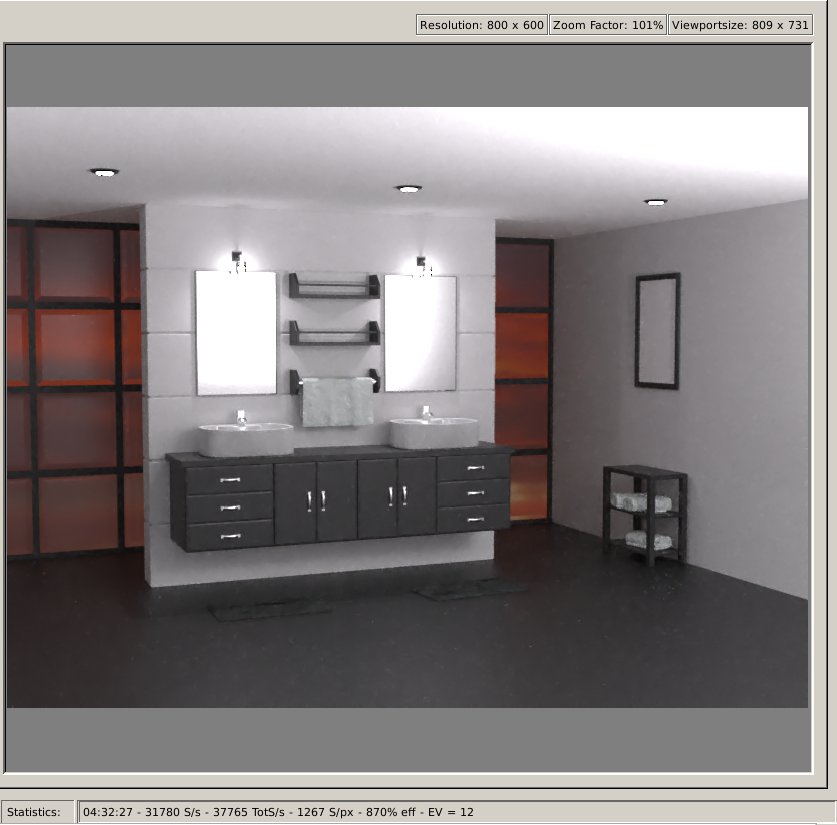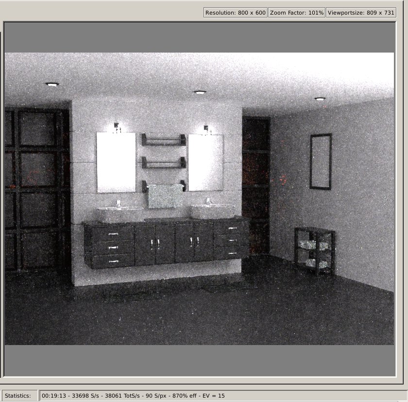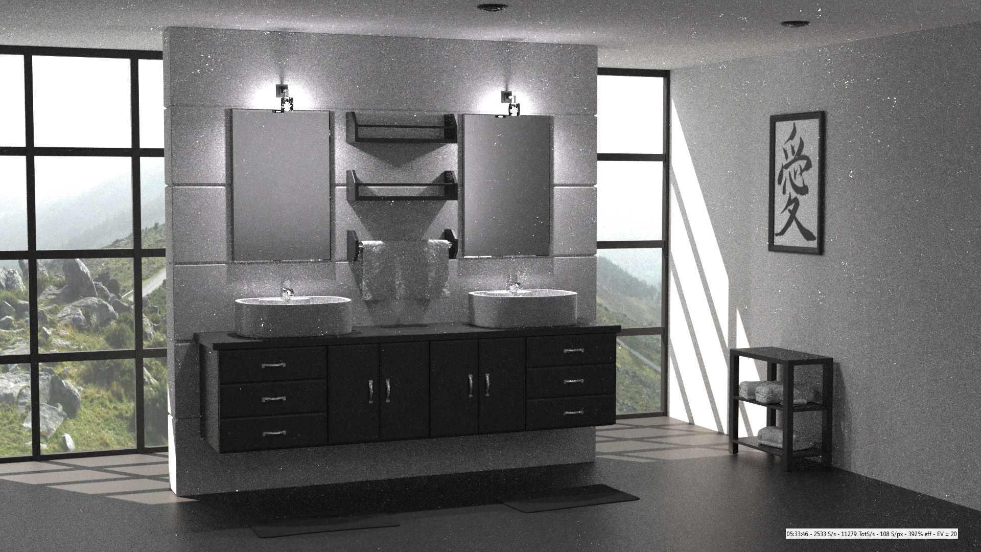 Sobre la escena del baño, por ejemplo, es cierto que con tus modificaciones fue más rápido. Cuando yo hice el render final, tardó más en alcanzar ese nivel de ruido, el problema es que cuanto más tiempo pasa, más despacio desaparece el ruido, y el resultado entre 5 y 10 horas se notaba, pero entre 10 y 30 era casi inapreciable la diferencia, seguía habiendo demasiado ruido.