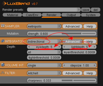 Lo siento, creo que los dije mal, eran eyedepth y lightdepth, están en el integrador bidireccional. Aquí adjunto una captura de estos parámetros. Estos días no estoy haciendo casi nada porque ando con unos trabajos y estoy usando ya thea a muerte, pero en cuanto pueda seguiré haciendo pruebas.