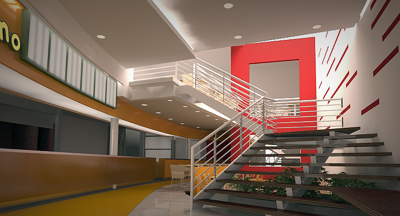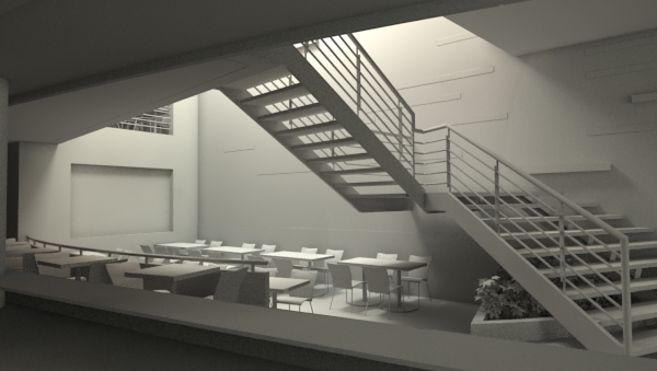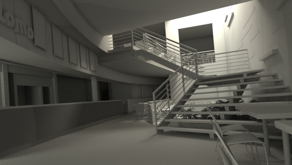 Hola, no lo veo bien, del mismo modo que digo las cosas cuando salen, ese render que acabas de enseñar no va por buen camino, tienes luces muy fuertes al fondo sobre la escalera, y el recuadro blanco sobre la pared roja, no entiendo bien su finalidad decorativa, es un espacio feo el que hace. La zona de las barras no sé por qué tiene que ir tan oscura, parece que más que un dependiente te va a salir un asesino en serie.