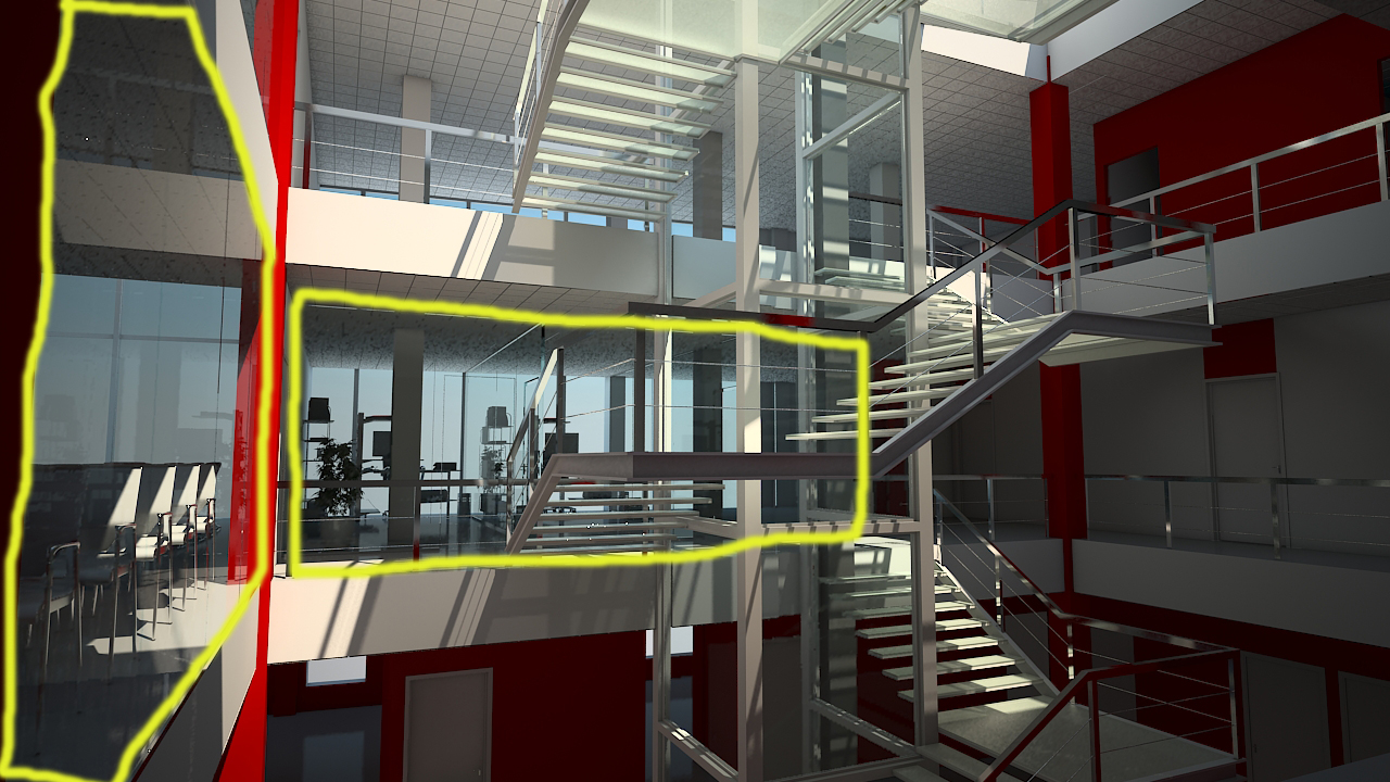 El problema es que las zonas donde se ve a través de los vidrios se ven las líneas dentadas como si se perdiera el antialiasing, la imagen pierde definición y aparece ruido en las zonas lejanas del techo. He marcado las zonas en amarillo.