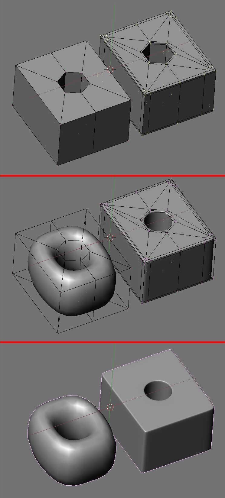 Fíjate que las formas del ejemplo, sin subdivisión son iguales, pero al subdividirlas varían dependiendo de la construcción de la malla. Un saludo.