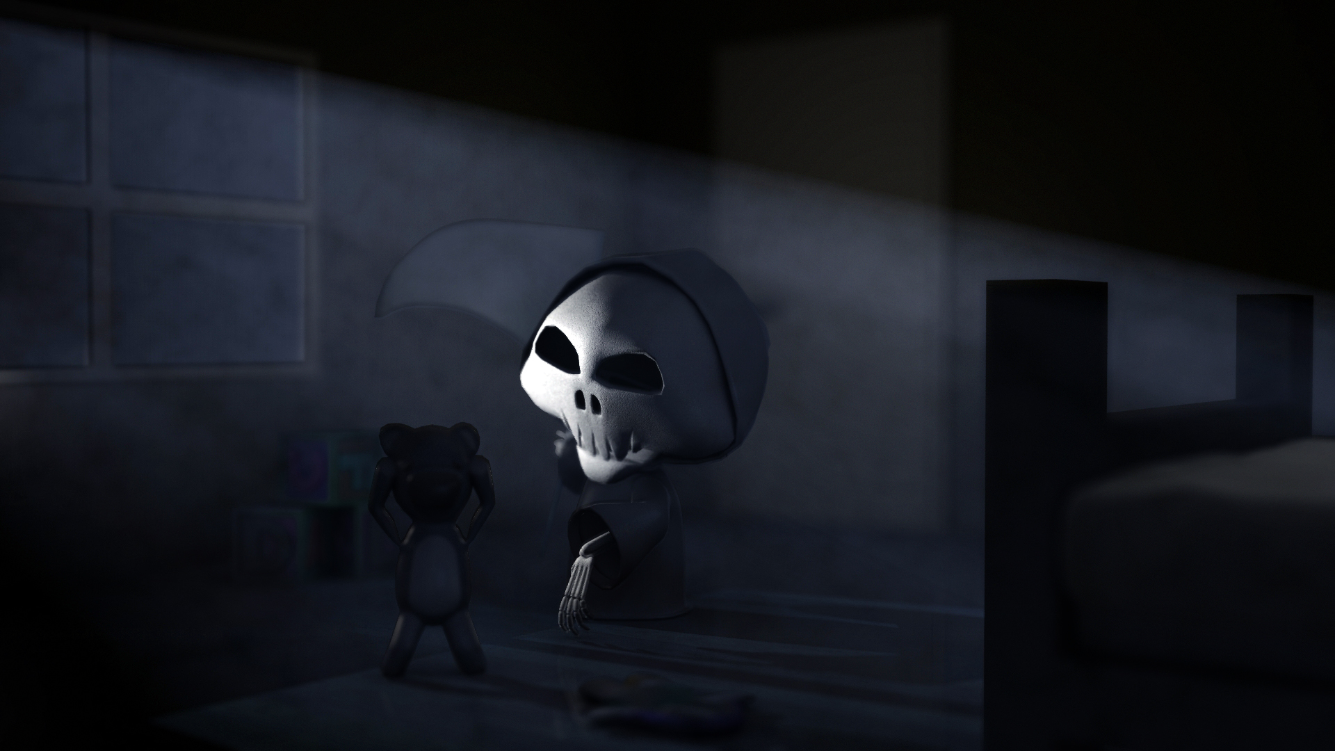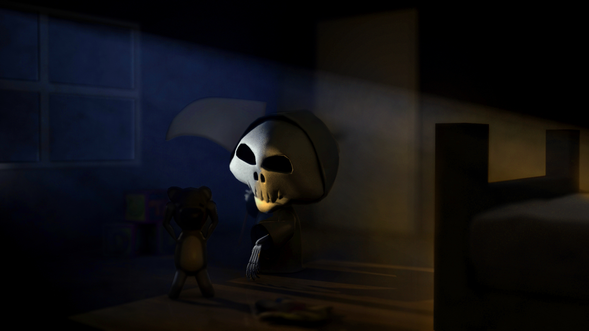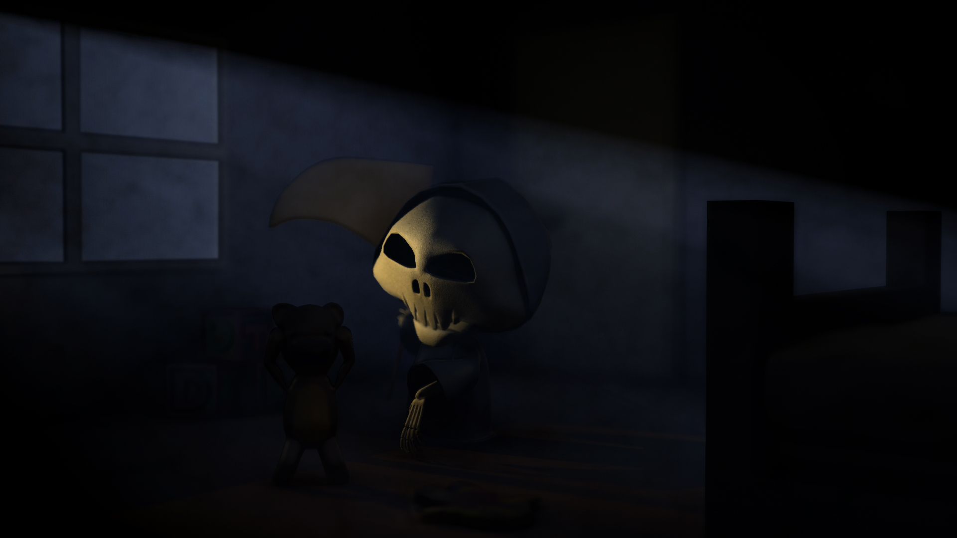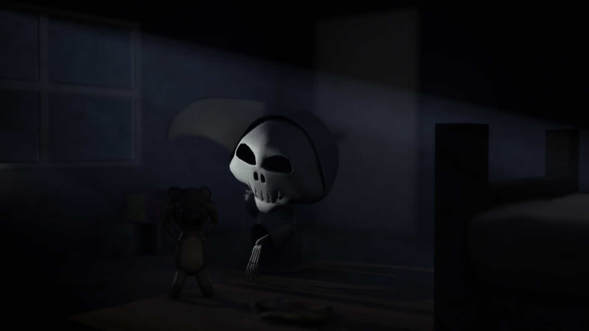 Hola. Una idea interesante a la que, a primera vista, sólo modificaría algún asunto de iluminación para mejorar su narrativa. En este tipo de escenas (y en la mayoría) funciona muy bien plantear la composición como una contraposición de sensaciones (algo que ya haces con la ternura del oso y la frialdad de la muerte). Puedes resaltar y subrayar esa contraposición usando una luz fría para iluminar a la muerte (ya la tienes en la tercera, una luz azul que venga de la ventana, arriba a la izquierda, es ideal) y una luz cálida que ilumine la escena desde el lado opuesto (una luz amarillenta/anaranjada que recuerde al calor del hogar, como filtrada por la puerta entreabierta de la habitación o su rendija inferior, desde abajo a la derecha, no tiene por qué tener una procedencia realista, basta con que esté).