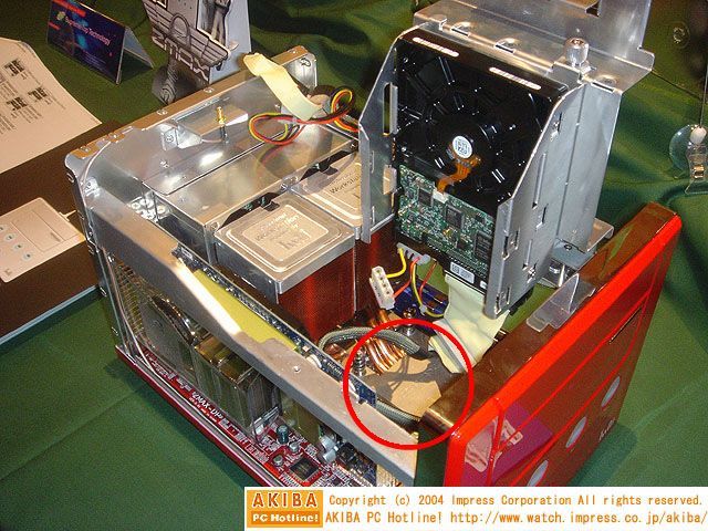 Así pequeño, rojo, hay que bonito, mírale que majo. Dos Opteron en caja SF, chúpate ésa Apple. He señalado los procesadores con un círculo, las piezas de cobre son dos enormes disipadores tipo heatpipe y si te fijas le han puesto una GFX 5950, que majos.