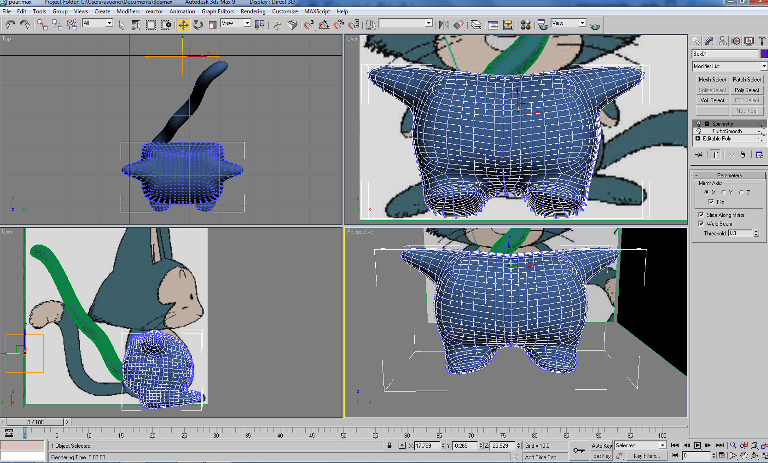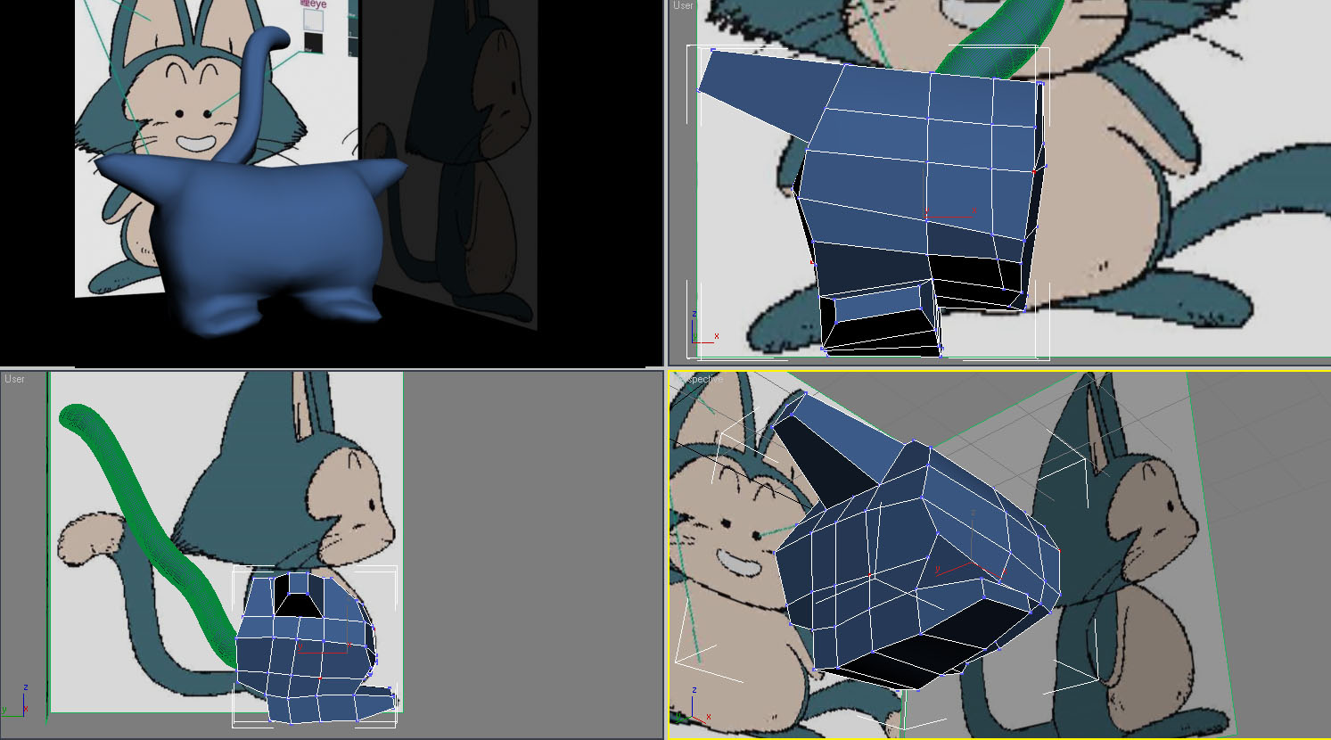 Hola. Vas por buen camino con el modelado. No hace mucho tiempo que hice un modelo de puar. Respecto a la cabeza te diría que comiences por una forma básica igual que con el cuerpo y vayas subdividiendo según requiera el modelo. Añade un modificador TurboSmooth y mientras modelas lo vas activando y desactivando para ver el modelo y retocar.