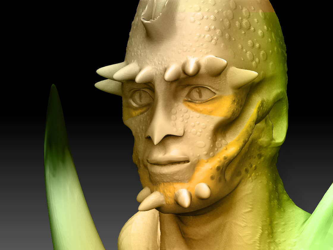 Pues es mi primer modelo en ZBrush, obviamente había hecho más, pero meros tutoriales para aprender y este es pura inspiración no use boceto, solo que me saliera de la cabeza, la verdad quería texturizarlo en 3ds Max y ojalá con Vray, pero la verdad todavía no se bien cómo hacer todo, así que lo doy por terminado el polypaint no me ayudó mucho así que, no lo pintare en el ZBrush, la verdad es falta de paciencia y de saber usar bien el ZBrush, así que, por lo menos doy por terminado el modelado, y luego ya veré como aprendo a texturizarlo en 3ds Max, UV maps, pero creo quetocaria hacer retopology, y aprender a sacar bien la malla para texturizarlo en Adobe Photoshop. Para muchos no es difícil, pero para mí es uf demasiado. Saludos, ah por cierto, es un guerrero de una raza alienígena, la verdad no pude sacarle más expresiones trate con las herramientas move, estándar del ZBrush y no pude, ¿cómo se hace?