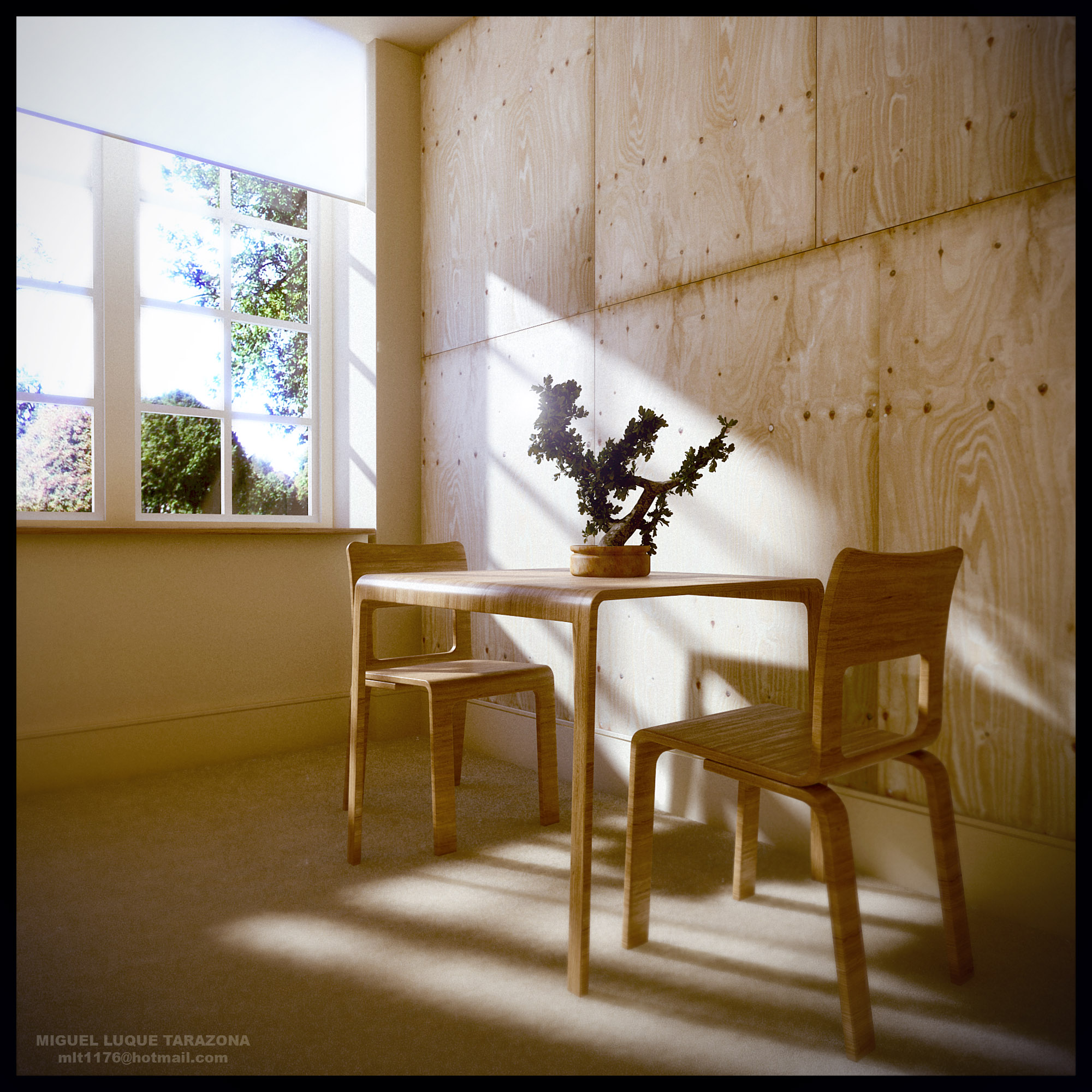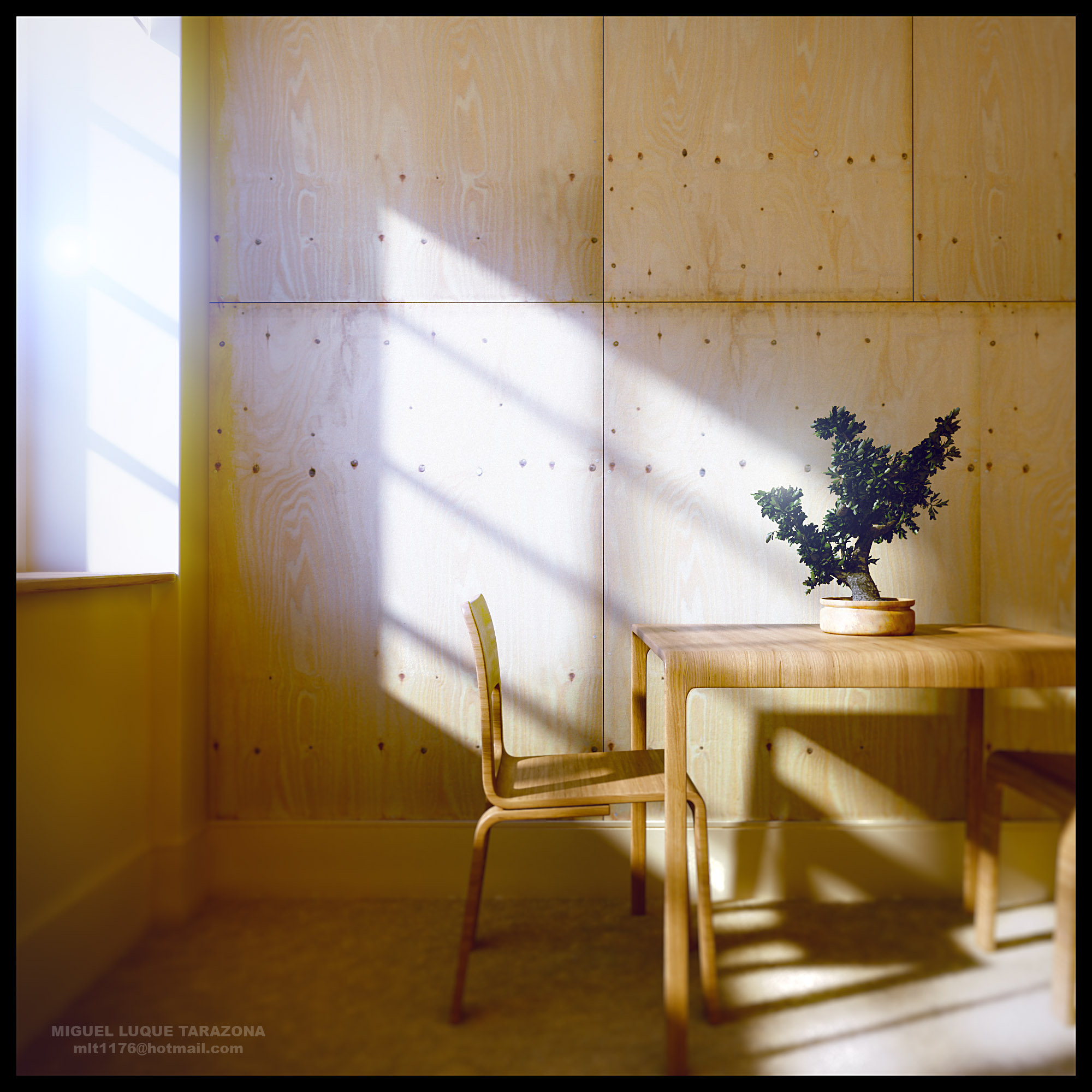 Miguel. 5 horas con un i7 me parece que es demasiado, y más con todo es ruido que tiene, es agregado en ps? Es es lo primero que noto, sobre todo en el piso que parece una alfombra, en la segunda imagen la haz querido disimular con el desenfoque, pero me parece que no quedo bien y término malogrando esa imagen, lo de las betas en las patas de las sillas no se notan siquiera con el desenfoque así que, no creo que importe mucho, lo que si se nota es el estore de la ventana que parece que saliera del techo, los paneles de la pared me gustan mucho, ganarían más con aún escena que los contraste más, la quemazón es su punto. En esta clase de escenas creo que los detalles son muy importantes por que al ser tan simples el foco visual se centra en los detalles que componen la escena así que, hay que trabajarlos bien especialmente para este tipo de presentaciones. Saludos.