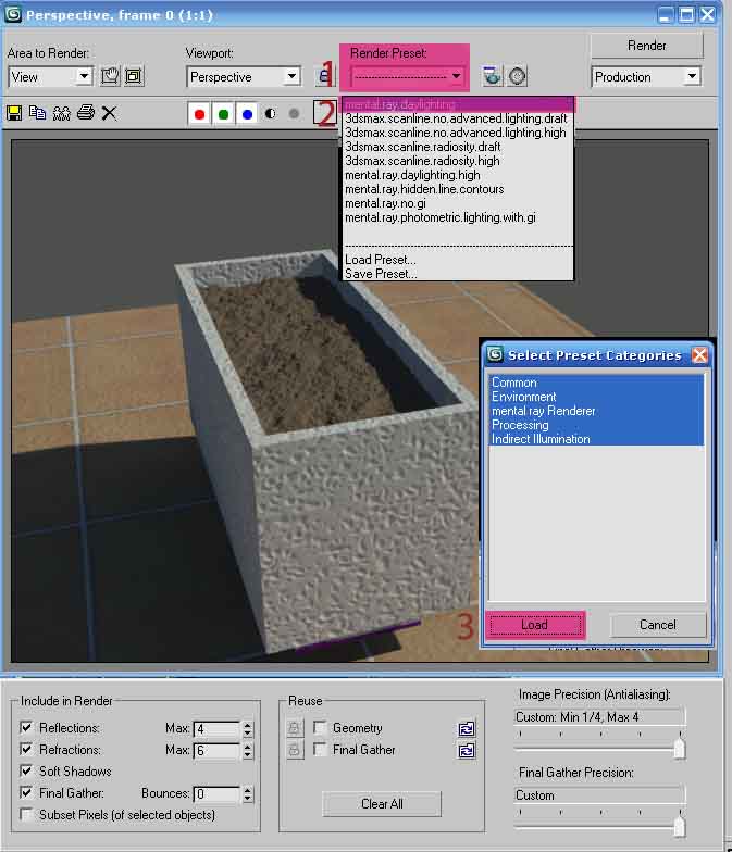 2) en la propia ventana de render en render preset puse Mental Ray, Daylight de saldrá ventana que tienes que confirmar.