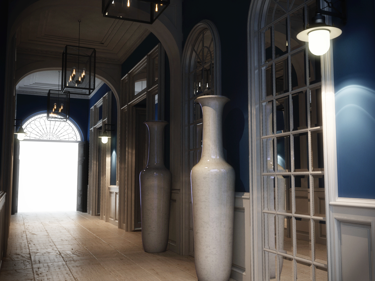 La escena te ha quedado bien. El único material que no me convence es la cerámica de los jarrones principales. Un saludo.