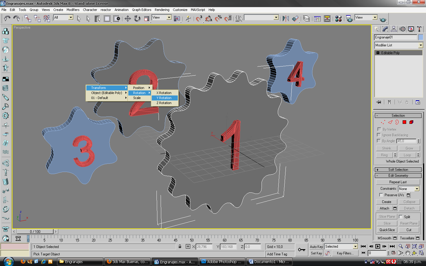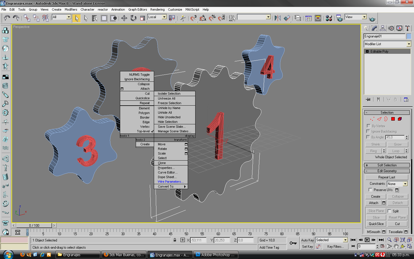 Seleccionamos engranaje01, y presionamos el botón derecho del mouse, del menú que aparece seleccionamos la opción wire parameters, como vemos en la figura motor_03, y a continuación las opciones transform, rotation, y rotation como vemos en la figura motor_04.
