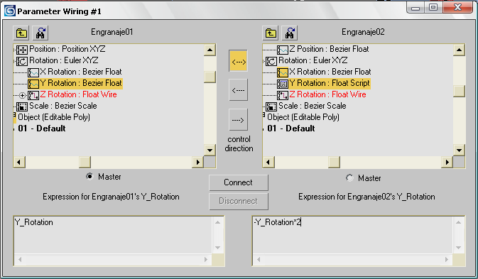 Nos aparece la ventana parameter wiring, que vemos el la figura motor_06. En control direction marcamos la opción de ambos sentidos. Veremos que hay dos cajas de texto y que ambas tienen la instrucción y_rotation. La caja de texto de engranaje01 la dejamos como esta, en la caja de texto de engranaje02 ponemos un - Delante de y, y escribimos *2, o sea -y_rotation*2. El signo - Es para que engranaje02 rote en sentido inverso al de engranaje01 y el asterisco funciona como signo de multiplicación, el resultado será que por cada vuelta completa que realice engranaje01, engranaje02 dará dos vueltas.