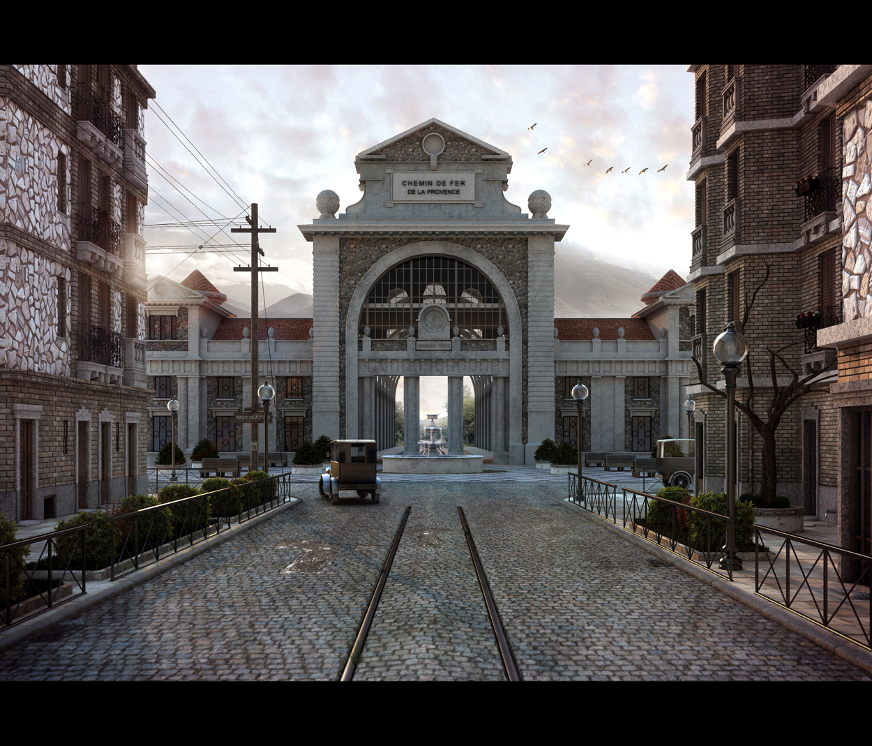 Como siempre pasa en los concursos, nunca tenemos el tiempo que quisiéramos para retocar aquí y, allá, así que, esto fue lo que me salió al final. El tema trataba de usar una estación de tren modelada por el mismo Matt y acomodarla en el paisaje que quisiéramos. Desde que vi el modelo se me ocurrió hacer una calle de los años 30. Una cosa que no me dejó muy satisfecho al final fue el tema de la gente, porque ya digo entre el tiempo para hacer todo esto no sabía si poner fotografías de gente y donde encontrarlas de esta época determinada. Un saludo a todos y para el que esté interesado en aprender 3d y mensaje producción pueden visitar www.3dluistutorials.com.