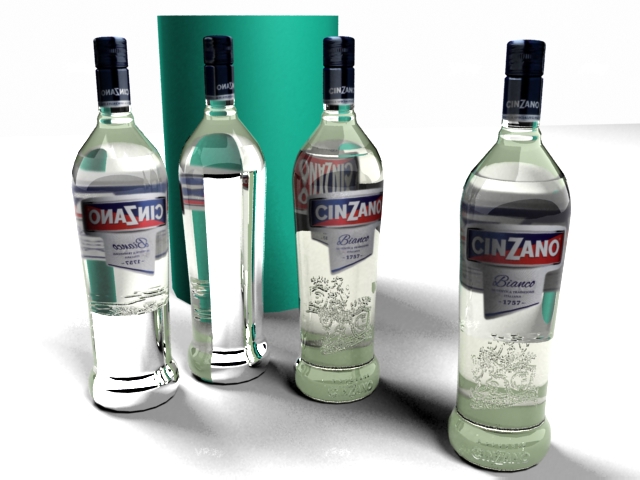 La segunda es una botella que tiene un mapa con refract al 100% y una máscara en Diffuse y en el reflect para poner la tapita y la etiqueta.