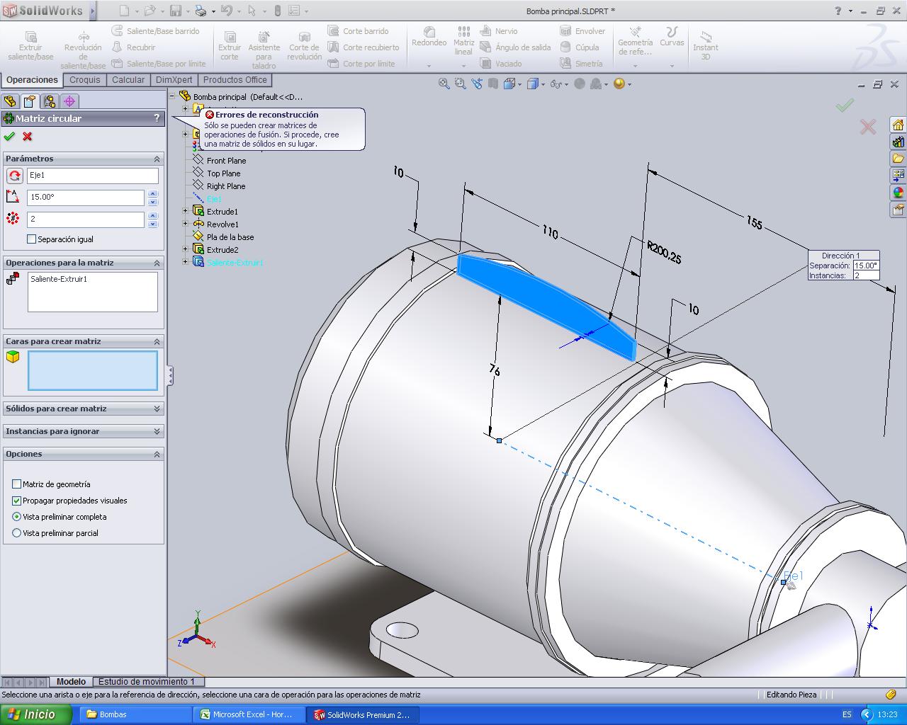 La cuestión es que cuando lo hago, SolidWorks me dice: errores de reconstrucción: sólo se pueden crear matrices de operación de fusión. Si procede, cree una matriz de sólidos en su lugar.