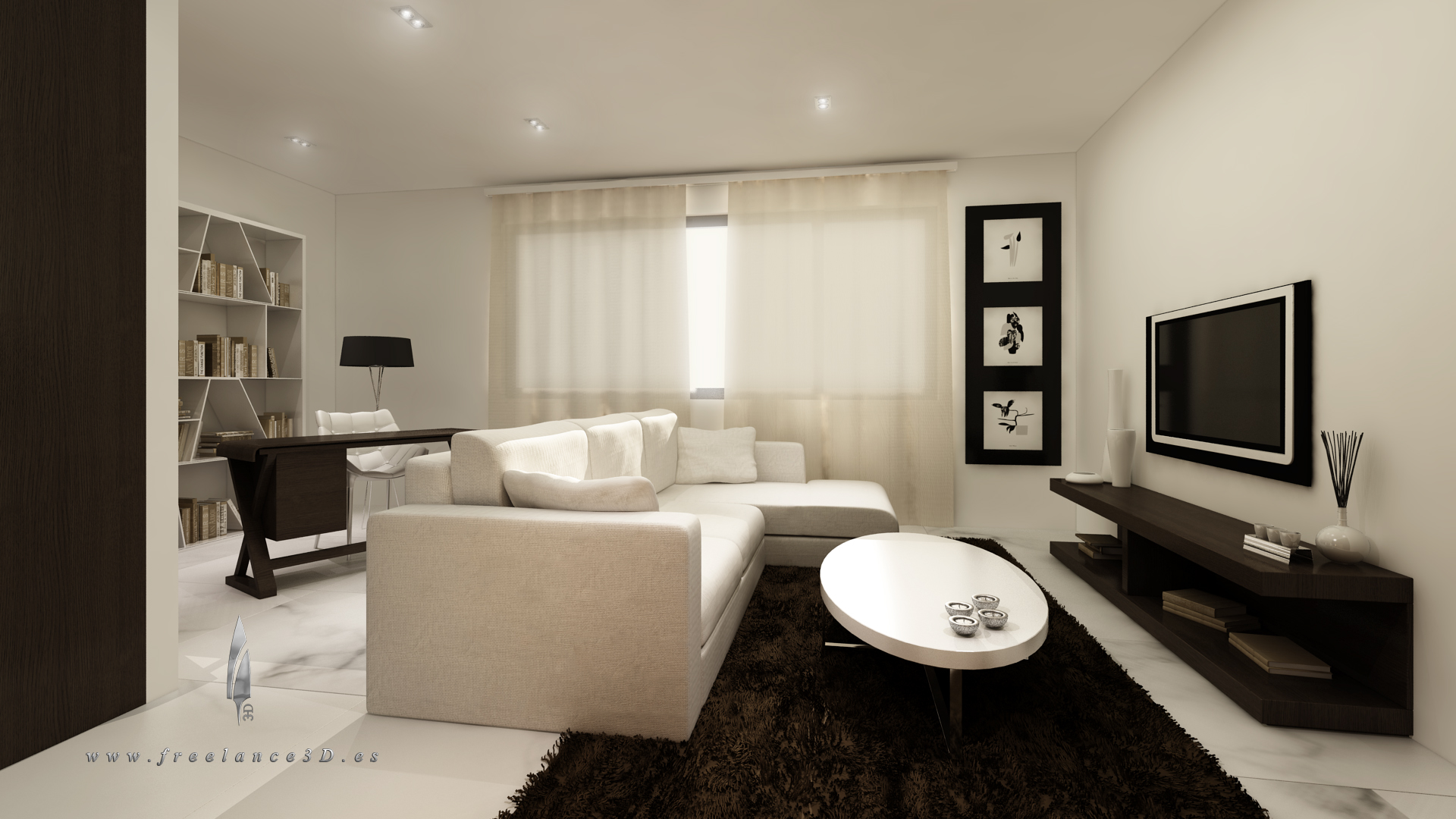 Aquí os dejo otro proyecto que he mejorado en el día de ayer. Todo está modelado desde cero, a excepción de la televisión, la alfombra, los libros, los objetos decorativos, lámpara de pie y cuadros. Saludos.