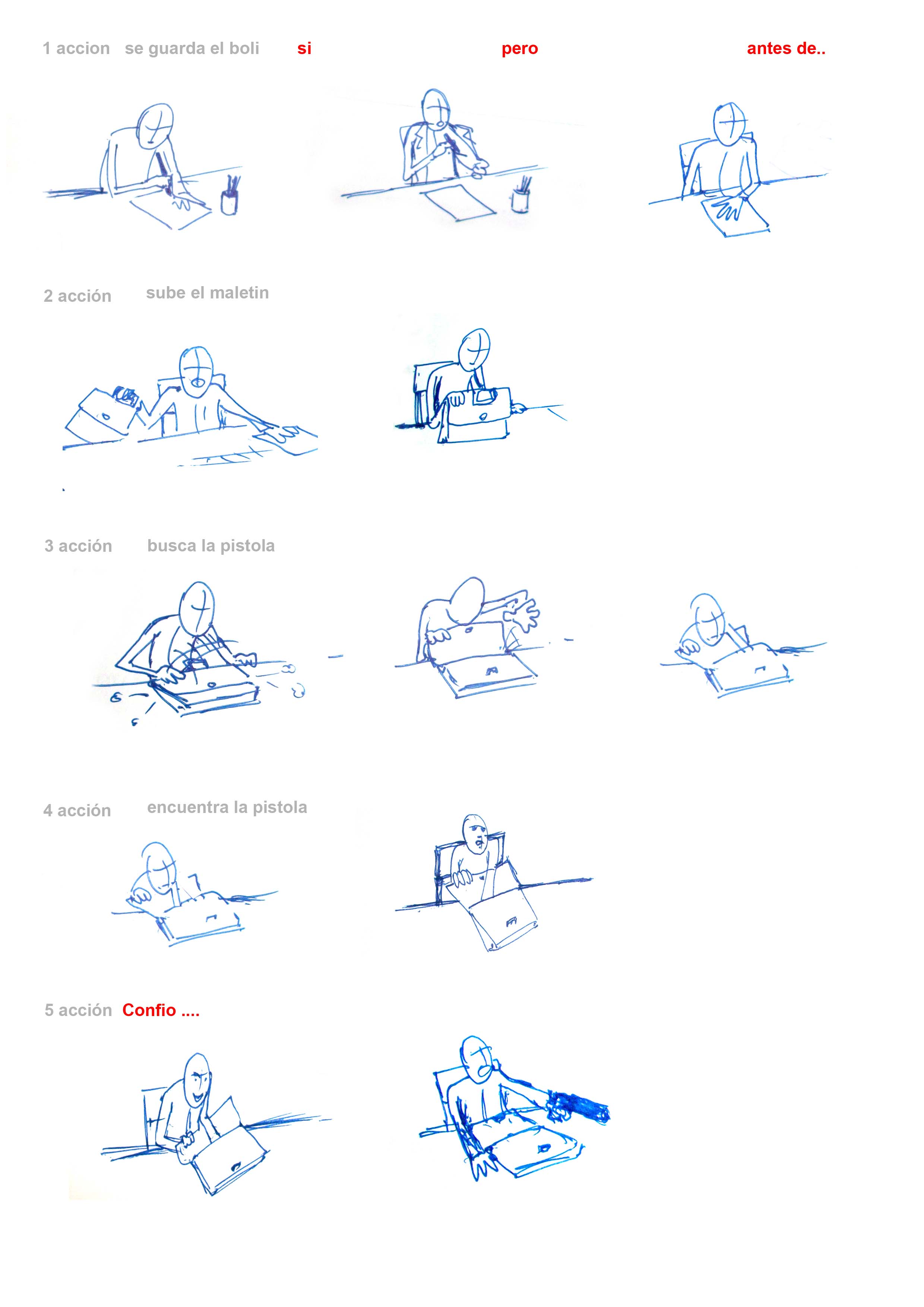 Sobre lo del bolígrafo, hombre, es difícil en tan poco tiempo explicar eso, como sé yo que el bolígrafo no es suyo y por eso se lo guarda? Yo lo que he entendido al verlo es que se lo guarda porque no va a firmar, pero eso no aporta nada, en cambio lo de buscar el maletín lo que hace es explicarme que el tío tiene una intención, que tiene algo planeado, me prepara para lo que va a pasar. Según tengo entendido, en animación es importante mostrar los procesos internos sin ser explícito. En fin, no intento convencerte eh, es solo mi opinión. Ánimo en cualquier caso.