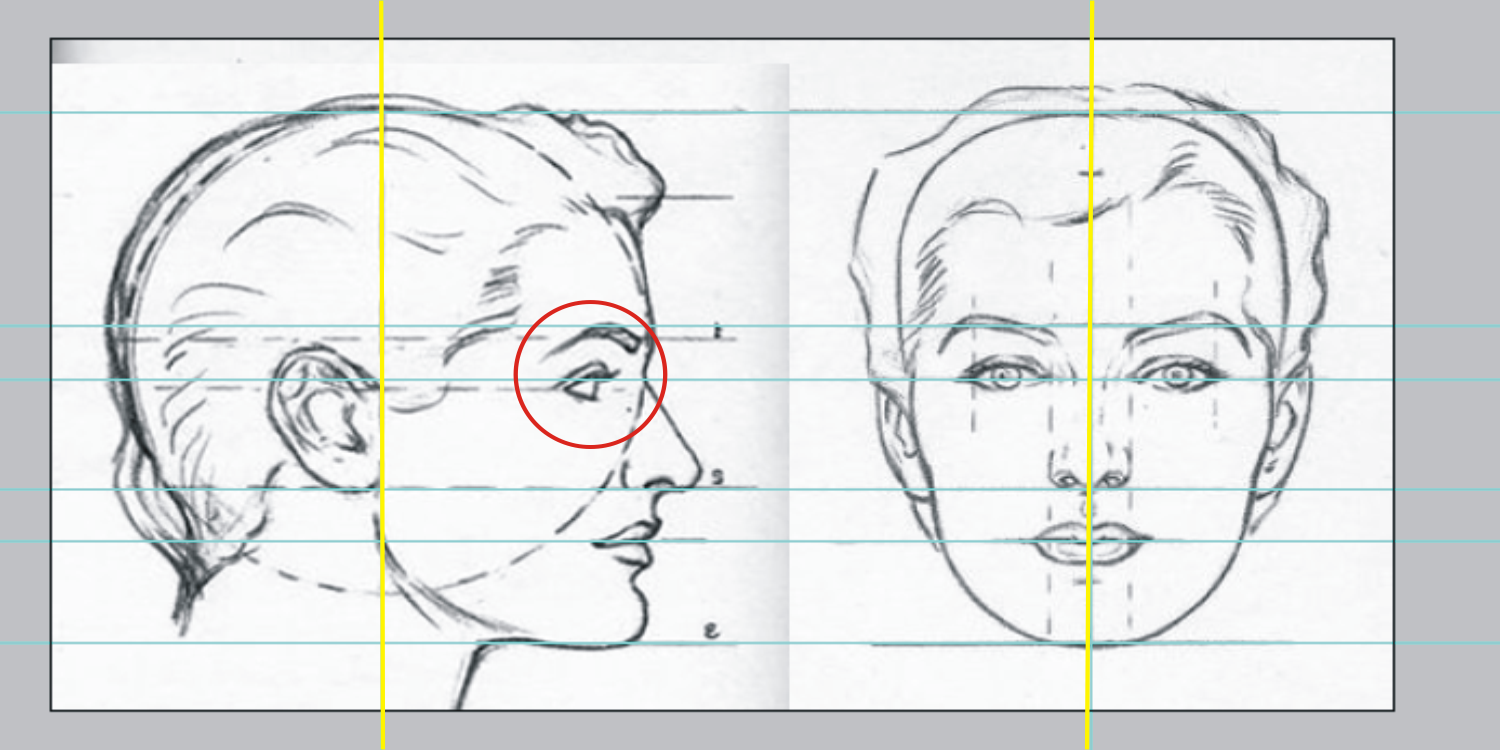 Fíjate en las verticales líneas amarillas que marqué en la primer imagen, la que corresponde a la vista lateral pasa entre la oreja y la mandíbula, en 3dsmax, el plano de la vista front tiene que atravesar al plano de la vista lateral por esa línea.