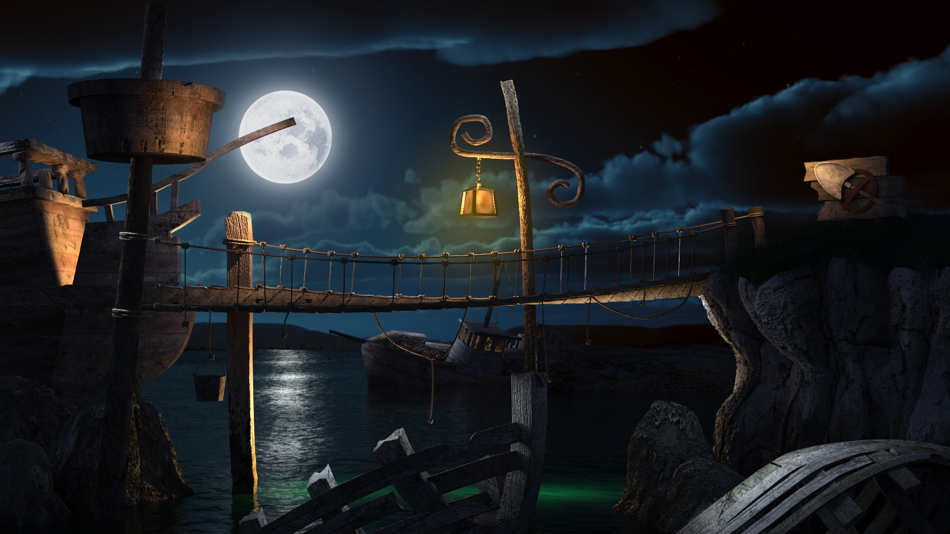 Hola. A mí me gusta la escena, está muy guapa. Lo único que no me cuadra es la parte izquierda de la imagen es la iluminación, sobre todo el tablón que sujeta el punte. Le pega muy fuerte la luz, al parecer, de la luna. Creo, que con esa luna la escena debería estar un poco más iluminada en determinadas zonas, como la parte derecha del puente, si la comparas con la izquierda. O por lo contrario oscurecer la zona del barco.