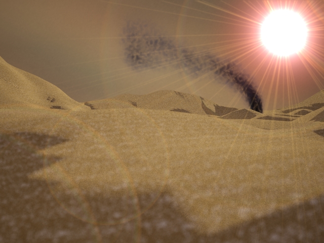 Hola, hace poco que estoy incursionándome con el FumeFX y se me ocurrió hacer una escena en el desierto, donde la cámara esta tirada en la arena y hay una columna de humo a lo lejos con un sol que te parte la espalda.