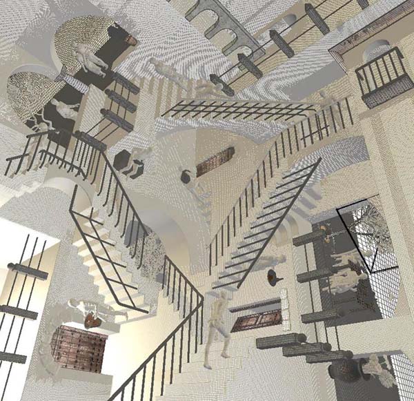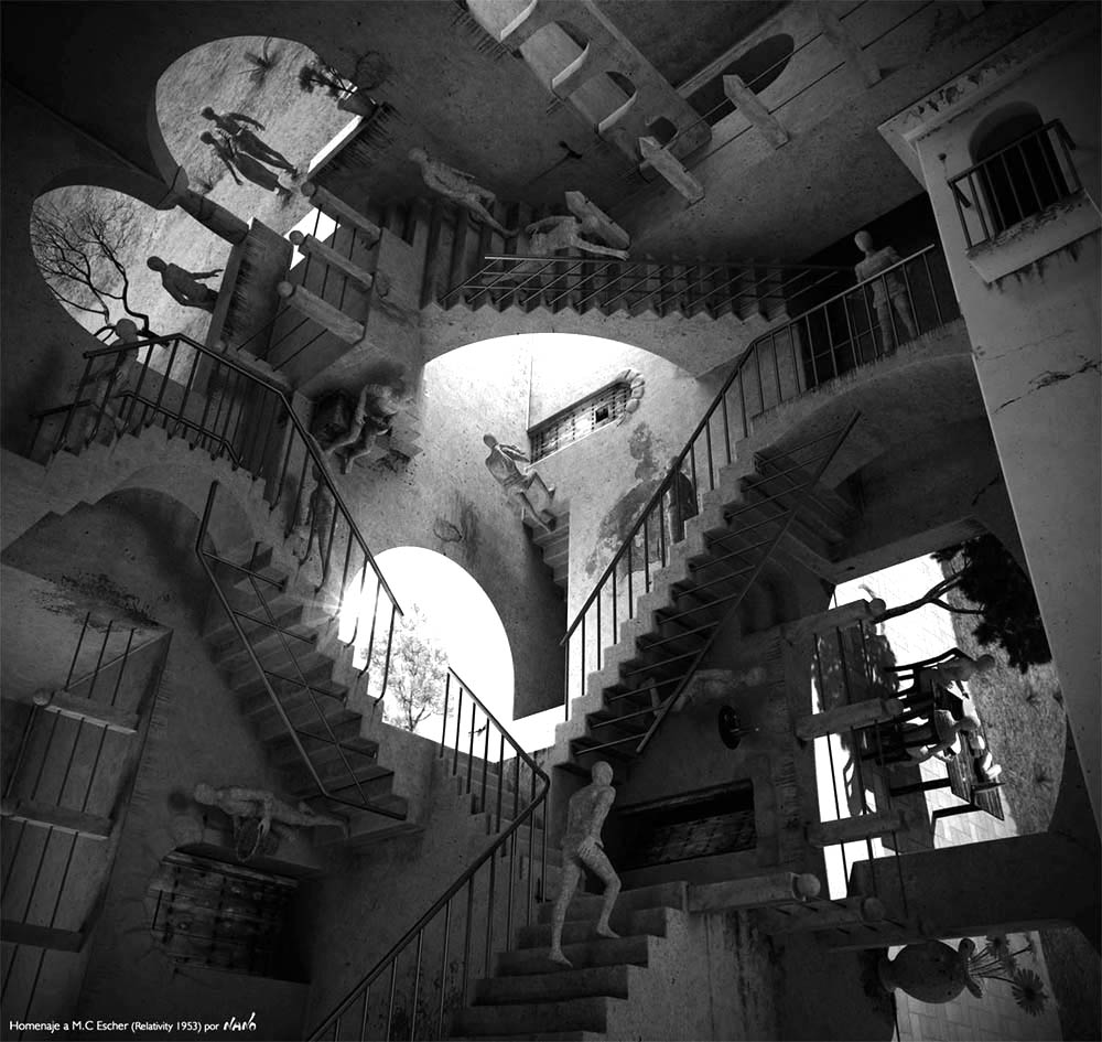 Hola. Este es un trabajo que realice para el concurso de lightrenderontour. El tema la arquitectura, o una buena excusa para homenajear la obra de Escher relativity -http://www.lk, CS, ucla.edu/lk/present, relativity, gif.