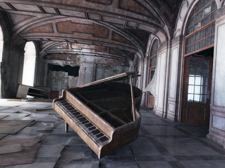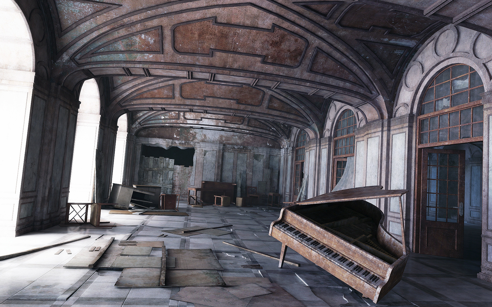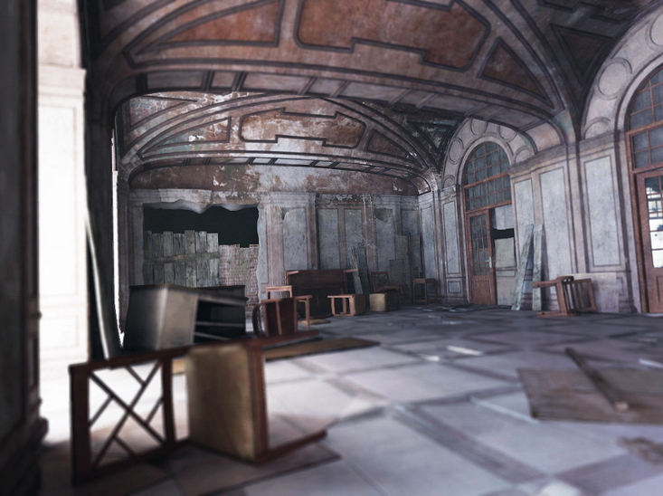 Aquí os dejo mi última contribución al mundo del 3d. La imagen esta basada en referencias reales, sacado de una fotografía de una gran sala, quizás salón de baile, completamente abandonado. Como digo esa fotografía la use como base para componer esta imagen. Para mí sobre todo ha sido un ejercicio de iluminación de interior, del cual estoy bastante satisfecho, aunque imagino que se pueden mejorar algunas cosas. La escena esta modelada con 3ds Max, texturas en Adobe Photoshop e iluminación y render con metal ray, también hay algo de postproducción en Adobe Photoshop.