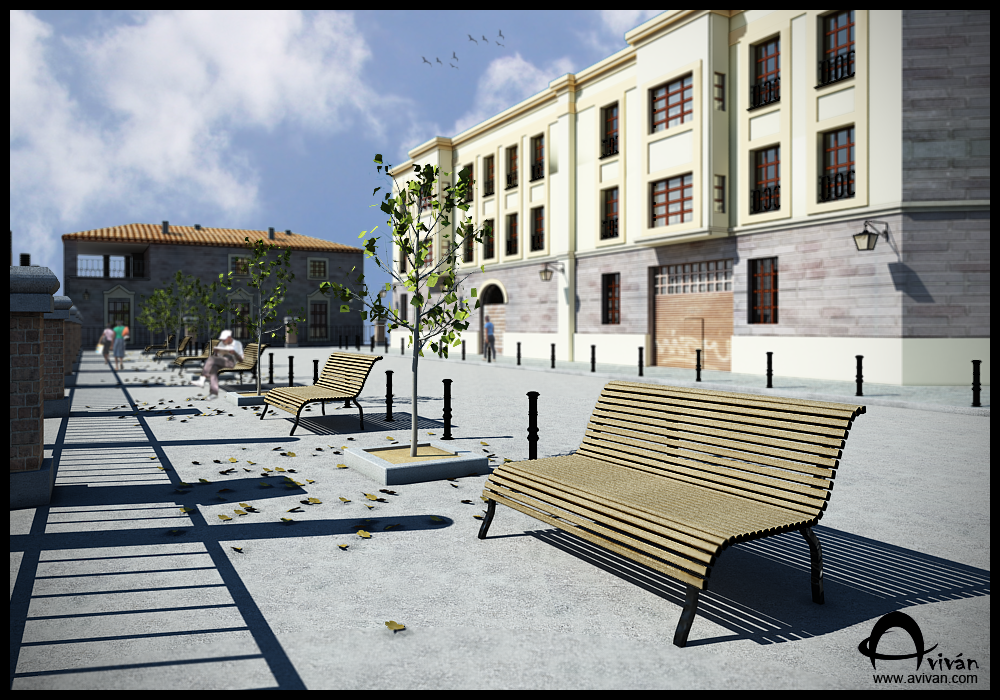 Para ser tu primer exterior es está bien, pero te voy a decir un par de cosas para mejorar. El desenfoque no está bien aplicado, el señor que está sentado está más desenfocado que el banco dónde está sentado, y el resto de bancos más alejados no están tan desenfocados como los árboles que están cerca, al igual que el edificio del fondo, y las sombras las veo algo duras, tendrían que ser más suaves según se alejan, y ahora un pregunta que motor usas? Saludos.