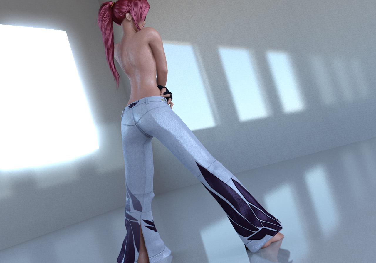 Misma imagen rehecha con más samples en la reflexión y el render que más me gusta de momento. La idea es que cuanto más nocturno sea el render más permisividad amorosa presente la moza, así que, en los renders de madrugada no sé si el pantalón seguirá ahí.