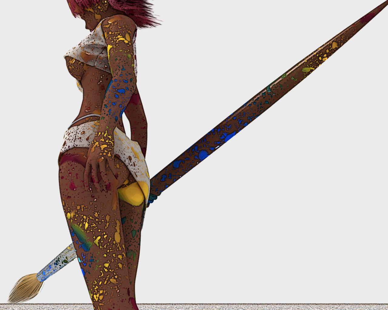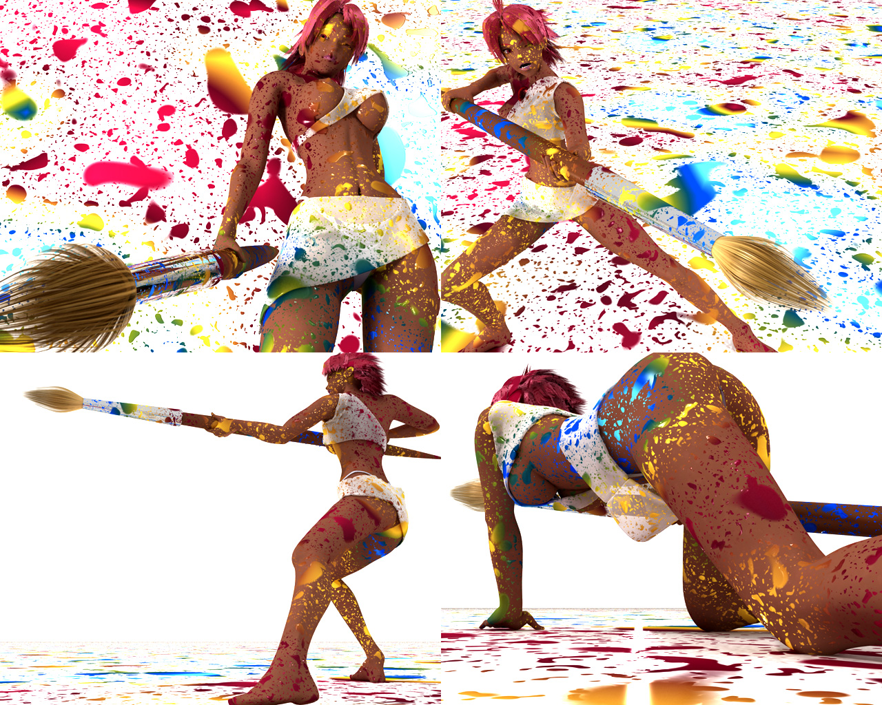 Estas son de Vray menos la última, que es de Mental Ray (descubrí lo del s skin material, sí, tiene demasiado sudor encima). En caso de seguir, usaría Mental Ray, y postproducción no ha habido casi nada, en las del pincel gigante nada.