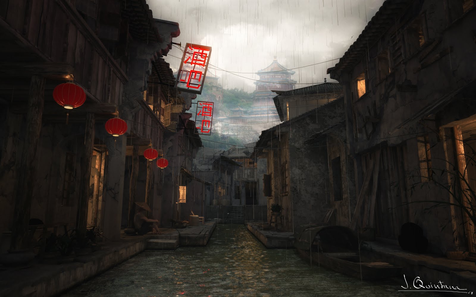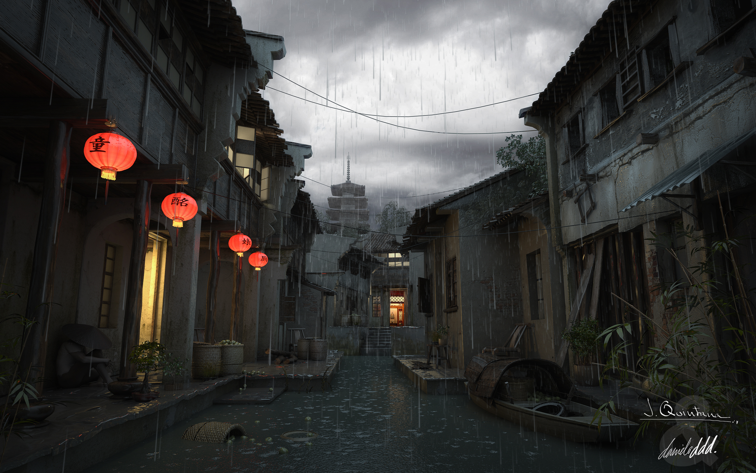 Me gusta más la de la derecha, la tuya Danielo, la otra la veo demasiado postproducida, confusa, está muy bien ¿eh? Las cosas como son, pero la tuya, tiene ese punto entre oscura y nítida, cuesta ver los detalles un poco por eso, pero se acaban viendo. Aunque está lloviendo, veo quizá un noise muy raro en el agua, imagino que igual son gotas. Las dos imágenes, o la idea en general me encanta, las callejuelas orientales, creo que ambas tienen su atmósfera. Un saludo.