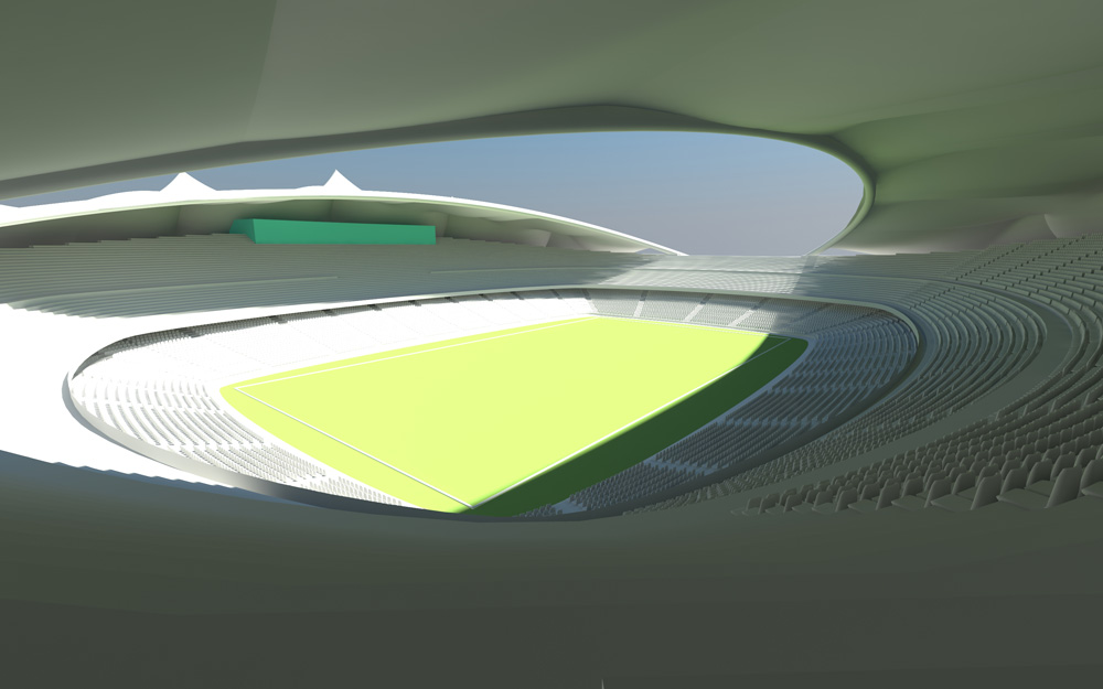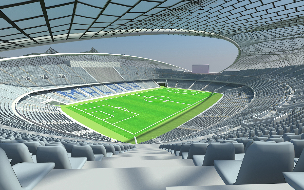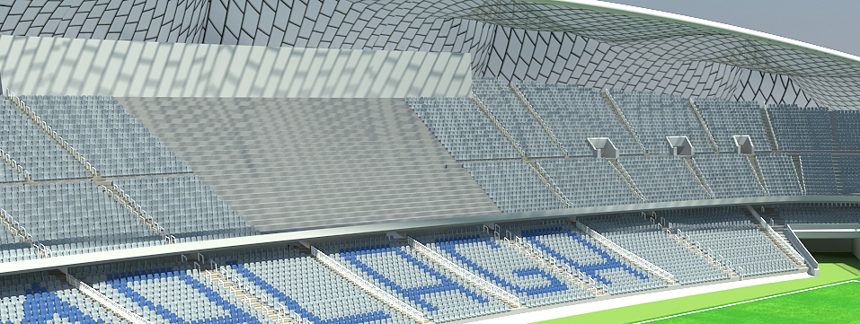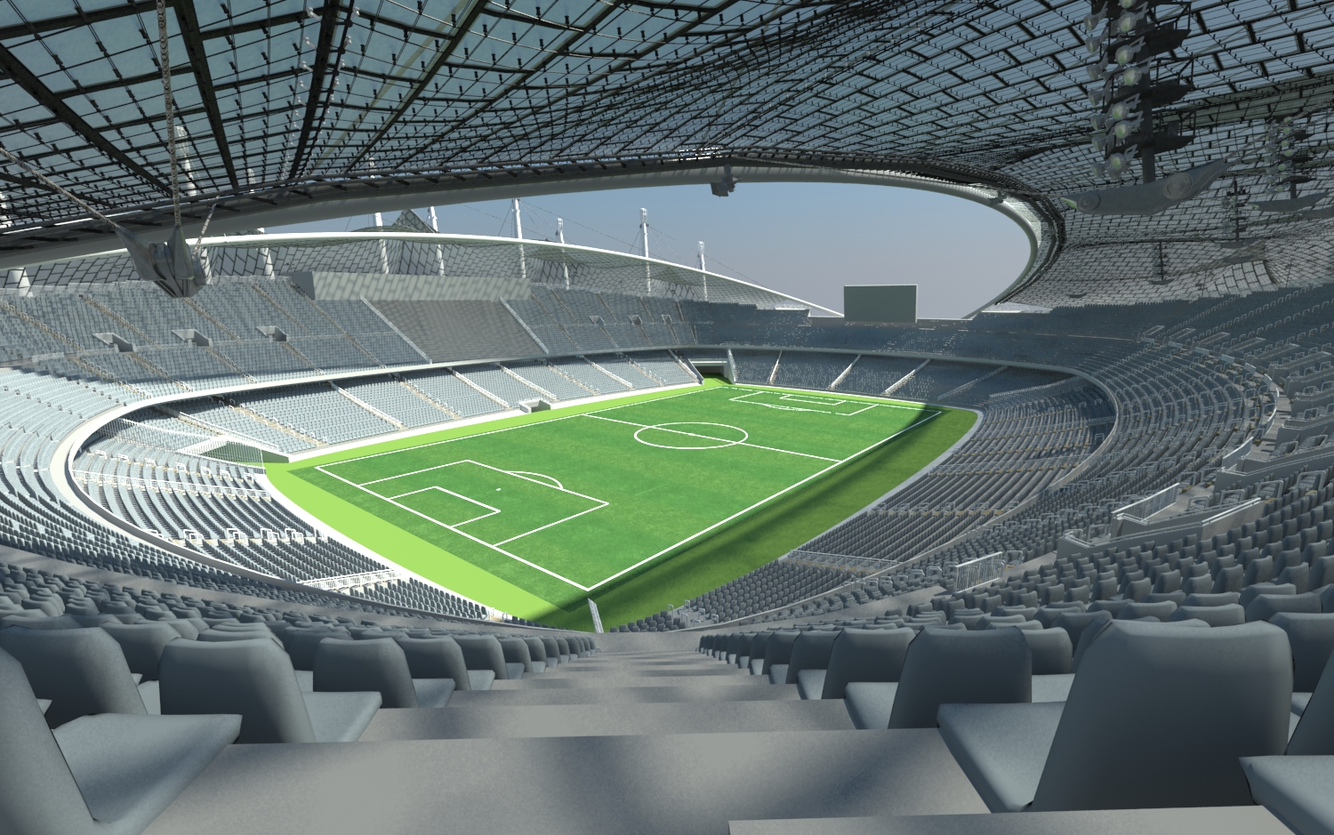 Si os ocurren cosas podéis decirme lo que sea, estoy abierto a ideas, salvo que el encuadre es el que es, eso no lo modificaré ya que lo que intento crear es la típica toma del estadio que suelen verse en los partidos cuando ponen los resultados en el descanso, o la típica imagen de gran angular abarcando la inmensidad, aunque el estadio no tenga dimensiones colosales. He contado los asientos, estando bien escalados y espaciados me sale un aforo de 40.000 personas, no es un estadio como he dicho colosal.