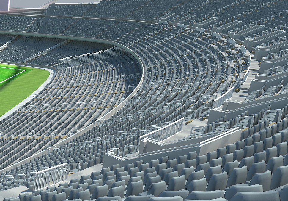 Si hay herramientas para eso, pero los asientos en un estadio de fútbol, normalmente son iguales, de una misma tipología, salvo en la zona alta de tribuna, como verás, aún vacía, dado que hay van los asientos de personajes ilustres, cargos, lo que viene siendo el palco oficial y también la zona de prensa, algo más compleja y con mesas para retransmitir.