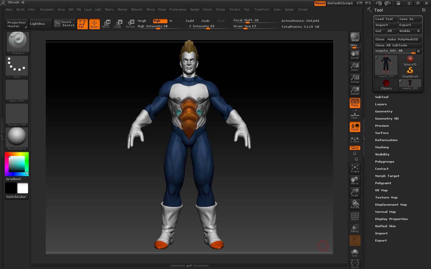 R. S.[/quote]Buenas rabidsquirrel. Si la malla la he hecho con subtool, aunque la he actualizado un poco, la idea principal como ya he comentado antes es hacer la versión de bo, pero también haré la primera versión de Vegeta, aunque con un toque más actual porque la rmadura de la serie la empecé a hacer y no me gustaba nada, aunque probaré a hacerle una armadura que sea más fiel. Gracias y un saludo.
