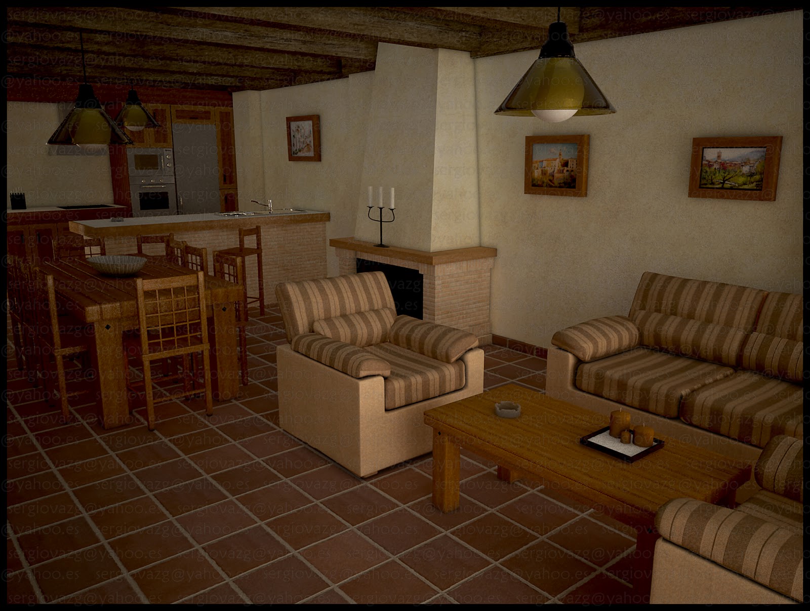 Vuelvo con mi proyecto de la casa rural. En esta ocasión os muestro dos interiores del salón-cocina. A ver qué os parece. Un saludo.