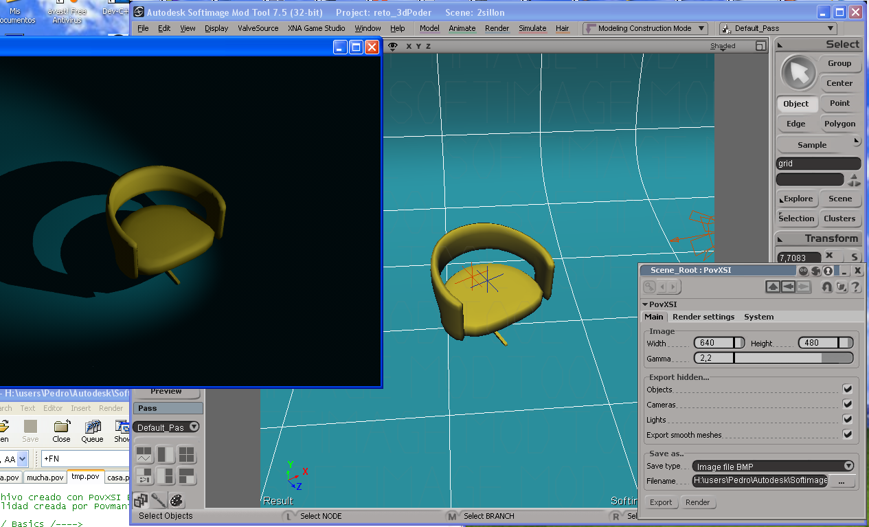 Bien, un modelo rápido para exportar a mi proyecto, bastante chapuza, solo como prueba. Y, un render rápido con Pov-Ray. Próximo intento; Houdini apprentice. Saludos.