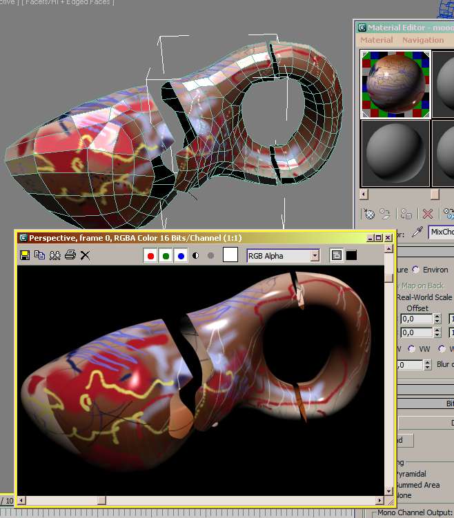 En 5 minutos Unwrapeé un modelo, pinté el mapa resultante, lo detaché en tres, y voi-lá..