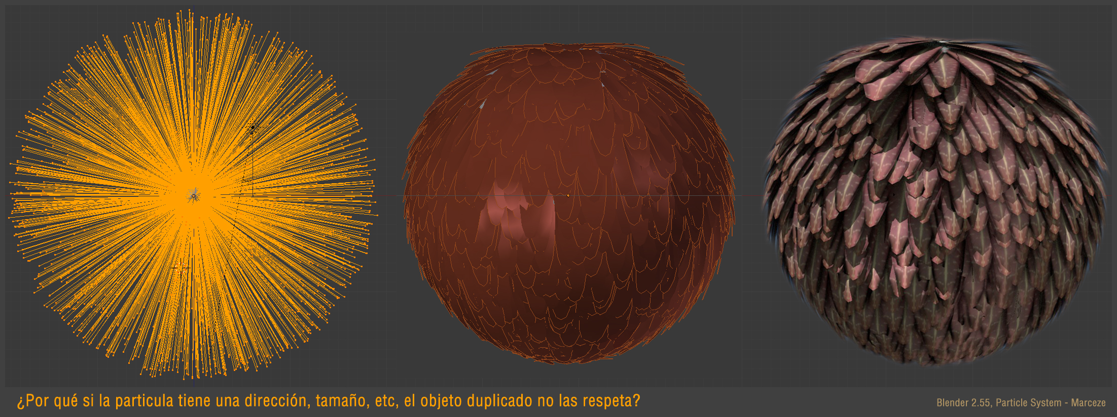 Bueno queridísima comunidad, hace mucho tiempo no poste por estos lares, cuestiones de tiempo esencialmente, ya saben lo que dicen que vale oro, pero bueno, en estos días que estoy de vacaciones aprovecho a pasar por aquí y les comento que me puse a practicar un ratio con Blender 2.55 y tengo un problema. Y es que intento hacer un pájaro, muy simplón, pero eso si con plumillas, y no le encuentro la vuelta de tuerca para resolver que las muy molestas se queden pegadas a su cara que les corresponde todo esto en con el sistema de partículas, para explicarme mejor hice una animación de lo que sucede, mi idea principal era que quedarán las plumas (objeto modelado) con la misma dirección que tiene su respectiva partícula. Ahí van los videos y las imágenes a ver si le podemos encontrar una solución, de antemano muchas gracias.