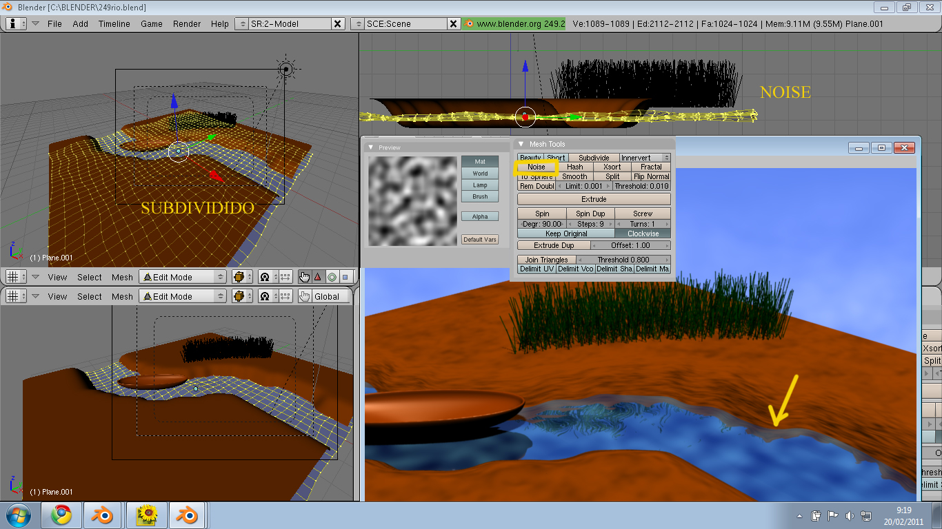 Antes se me ha olvidado decirte que para que funcione el noise, debe estar el plano subdividido. Subo una imagen que creo que se ve mejor.
