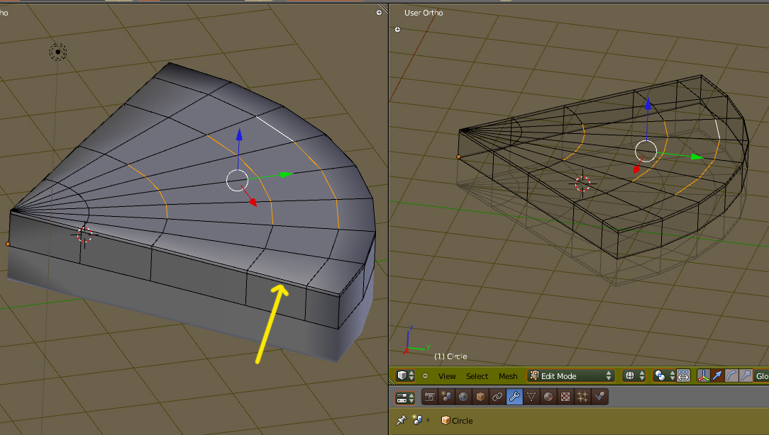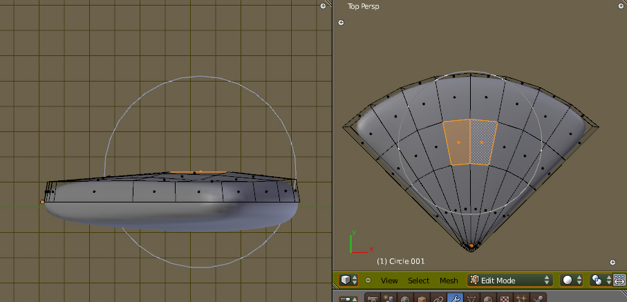 Una vez tiene el triángulo (o cómo se llame) lo extrudes para el grosor (una o dos veces) y por último para hacer que el centro se desplace uniformemente, seleccione un vértice central (o 2-3-etc) - Presionas la letra o y mueve ese vértice hacia arriba. Sale un círculo de influencia que hace arrastrar a los vértices cercanos. Cambiando con la rueda central del ratón el tamaño de ese círculo de influencia puedes cambiar ese tipo de influencia.