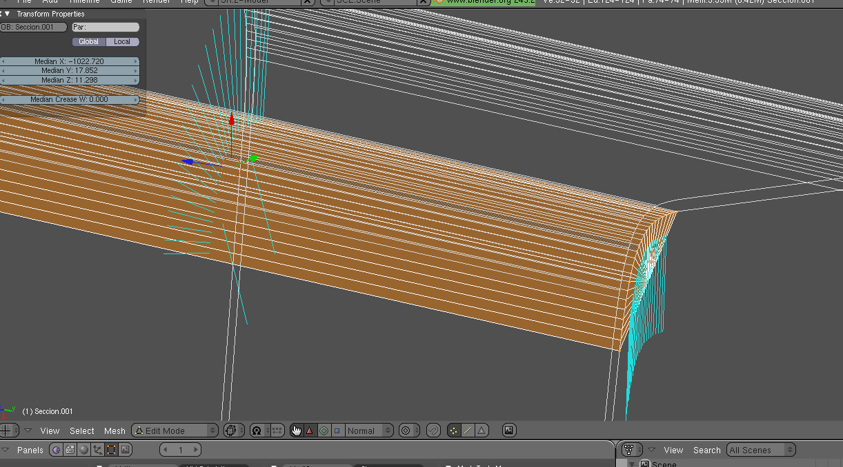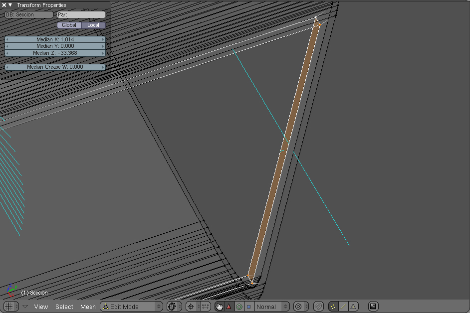 Lo cual me da muchos dolores de cabeza, entre ellos los más problemáticos: reflejo de superficie a la hora del render (uso Yafray) y modelado, ya que se hace imposible desplazar un plano en la dirección de su verdadera normal, que no es la que muestra Blender.